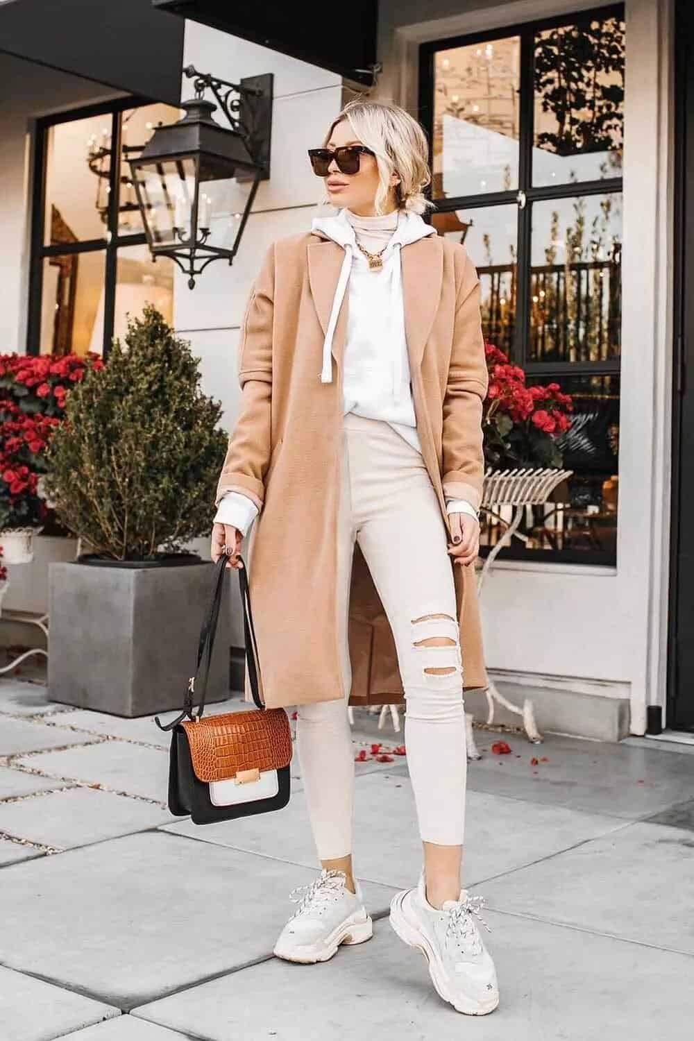 Embrace the perfect blend of comfort and style with this effortlessly chic fall bar outfit. The star of this ensemble is the luxurious camel coat, a timeless piece that exudes sophistication while keeping you cozy on crisp autumn evenings. Paired with distressed white skinny jeans and a white hoodie, this look strikes the ideal balance between casual and refined. The chunky white sneakers add a trendy, athleisure-inspired touch, ensuring comfort for a night out on the town. Accessorize with oversized sunglasses and a statement necklace to elevate the outfit, while the structured handbag with contrasting textures adds a final polished element. This look is perfect for those seeking a fashionable yet laid-back vibe for their fall bar hopping adventures.