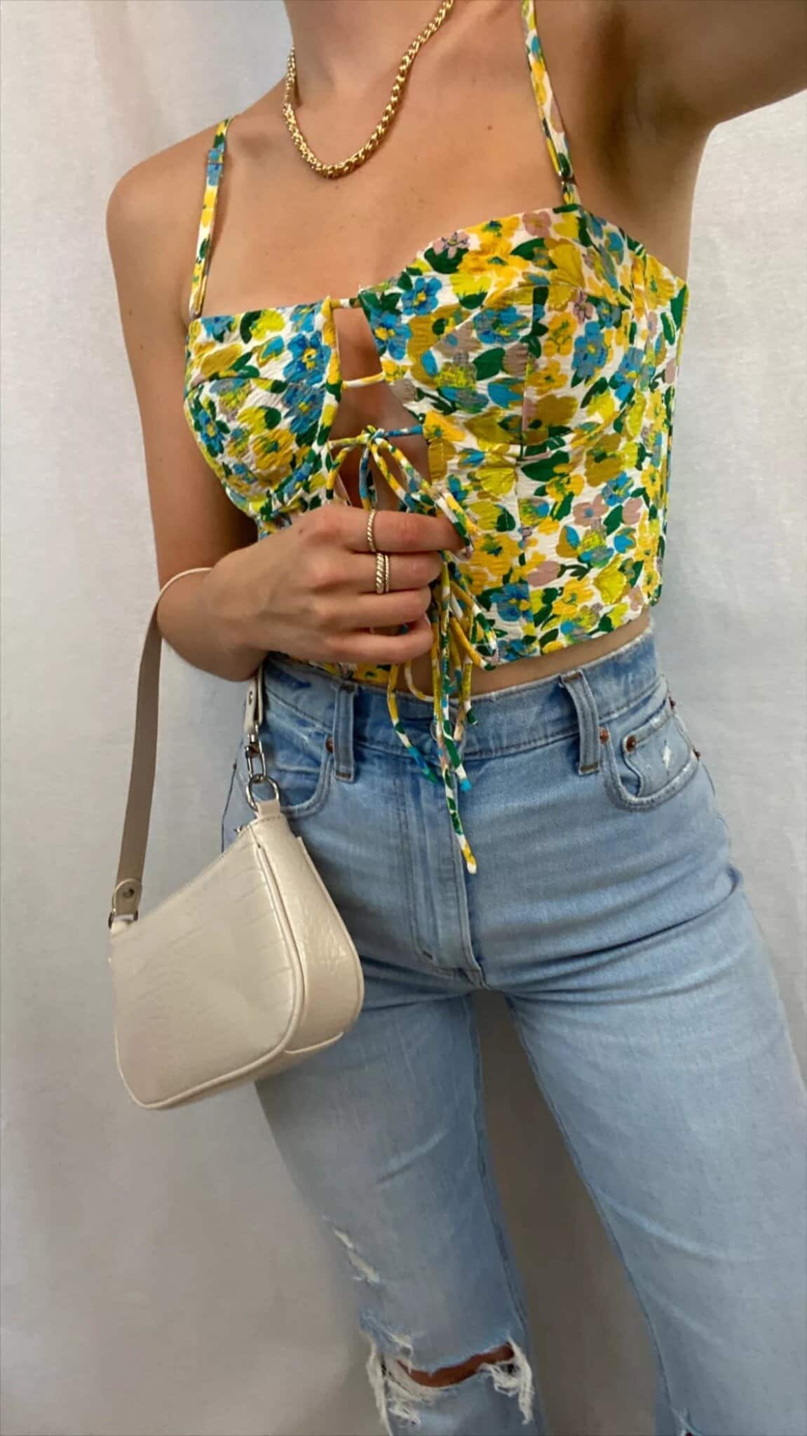 Embrace the last whispers of summer with this vibrant floral crop top paired with classic light-wash denim. The bustier-style top features a cheerful yellow and blue floral print, perfectly balancing cozy fall vibes with a touch of warm-weather nostalgia. The front tie detail and cutout add a flirty element, while the halter straps offer versatility for layering as temperatures drop. Accessorize with a gold chain necklace and a neutral mini bag to complete this effortlessly chic bar-ready ensemble. This look seamlessly transitions from day to night, making it an ideal choice for those crisp autumn evenings out on the town.