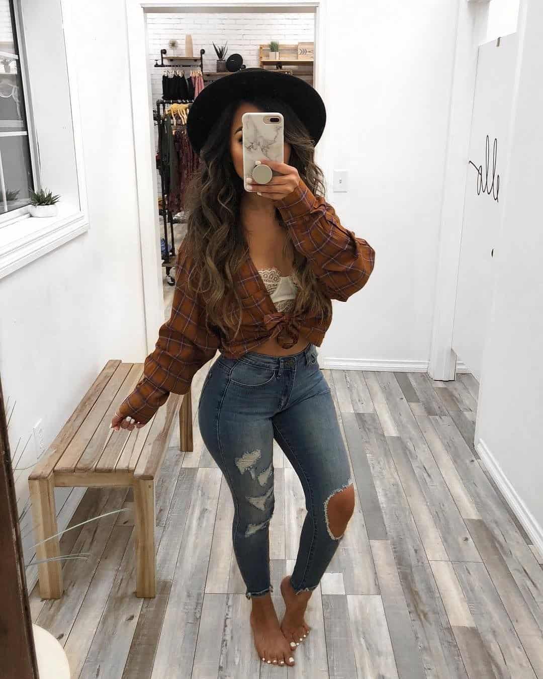 This outfit epitomizes the perfect balance of cozy and chic for a fall bar night. The rust-colored plaid crop top with its warm tones and tie-front detail screams autumn, while the distressed skinny jeans add an edgy flair. The combination creates a laid-back yet stylish look that’s sure to turn heads. Accessorized with a wide-brimmed black hat, this ensemble elevates the classic jeans-and-top combo to a fashion-forward statement. The cropped length of the top allows for a hint of skin, making it ideal for those warmer fall evenings or heated dance floors. This look effortlessly transitions from day to night, making it a versatile choice for your fall bar-hopping adventures.