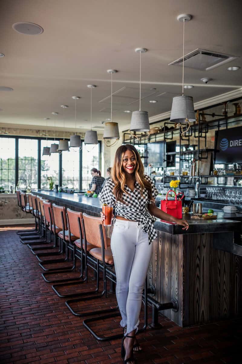 Embrace the perfect blend of casual charm and sophistication with this eye-catching ensemble. The gingham wrap top adds a playful touch to your fall bar outfit, while the crisp white jeans keep the look fresh and modern. This combination strikes the ideal balance between cozy and chic, making it a standout choice for autumn evenings out. The wrap style flatters the figure, while the black and white check pattern offers a timeless appeal that’s right on-trend for the season. Accessorize with a pop of color, like the vibrant red handbag shown, to elevate the outfit and turn heads as you sip your favorite fall cocktail. This look effortlessly transitions from day to night, proving that cozy-chic can be both comfortable and stylish.