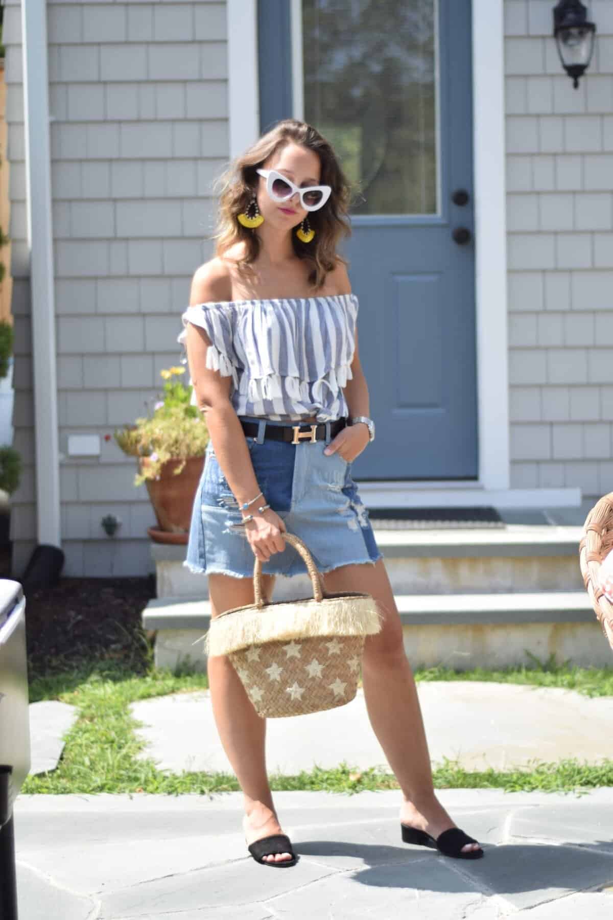 Effortlessly transition your summer favorites into fall with this eye-catching ensemble. The off-shoulder striped top adds a breezy, romantic touch while the denim mini skirt keeps things casual and cool. Accessorize with statement sunglasses, bold earrings, and a trendy straw bag to elevate the look. The designer belt adds a touch of luxury, making this outfit perfect for a laid-back happy hour or a weekend brunch with friends. As temperatures drop, simply layer with a leather jacket or cozy cardigan to maintain that cozy-chic vibe all season long.