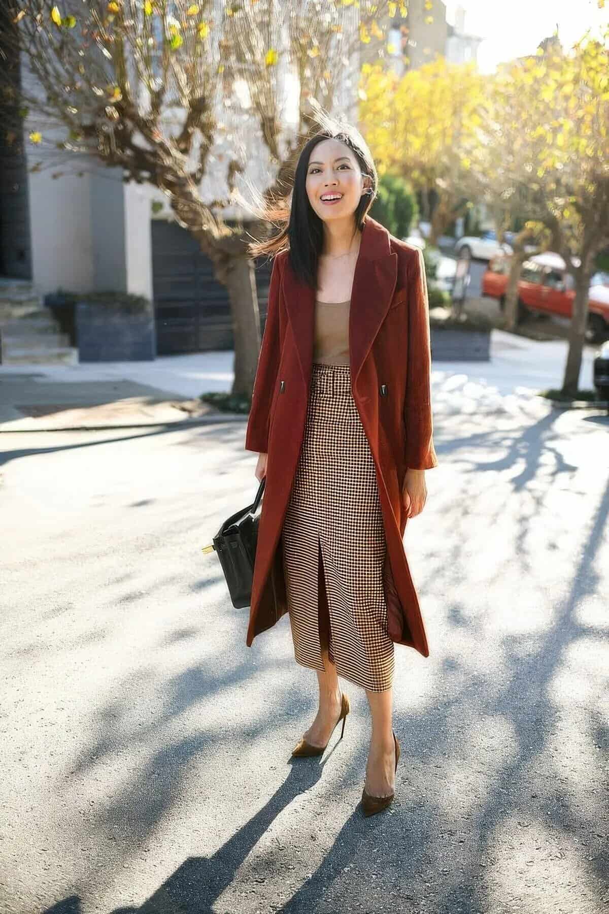 Embrace the crisp fall air with this sophisticated ensemble that seamlessly blends cozy and chic. The striking rust-colored longline coat adds a bold pop of autumnal warmth, perfectly complementing the neutral tones beneath. A fitted beige top pairs effortlessly with a high-waisted, checkered midi skirt, creating a sleek silhouette that’s both comfortable and stylish. Brown pumps elongate the legs while maintaining the outfit’s earthy palette. Accessorized with a structured black handbag, this look strikes the perfect balance between casual and dressy, making it ideal for sipping cocktails at a trendy bar or enjoying a night out on the town. The overall effect is polished yet approachable, embodying the essence of fall fashion.