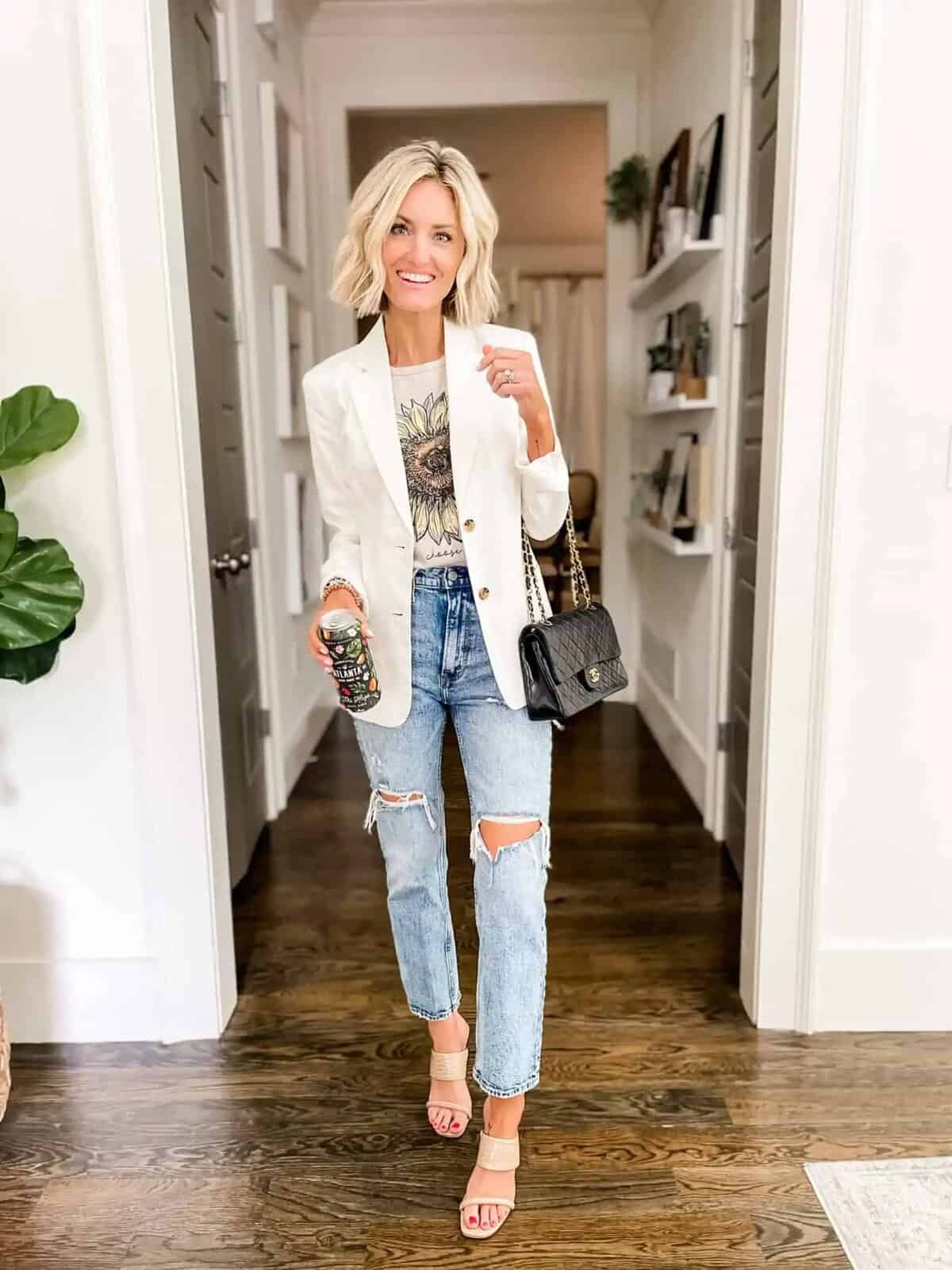 Elevate your fall bar style with this perfect blend of casual chic and polished sophistication. A crisp white blazer adds a touch of elegance to distressed boyfriend jeans, creating an effortlessly cool contrast. The graphic tee featuring a sunflower print adds a playful, seasonal element, while neutral sandals keep the look relaxed. Accessorize with a classic quilted handbag for a hint of luxury. This ensemble strikes the ideal balance between comfort and style, making it a standout choice for those cozy-chic fall evenings at the bar. It’s an outfit that says you’re ready for both fun and fashion, guaranteed to turn heads without trying too hard.