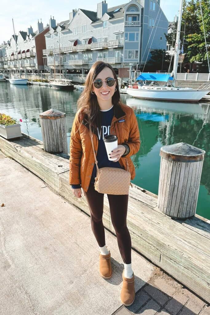 This outfit seamlessly blends cozy fall comfort with a touch of seaside sophistication. The rust-colored quilted jacket adds warmth and a rich autumnal hue, perfectly complementing the navy top underneath. Sleek brown leggings and tan ankle boots create a streamlined silhouette, ideal for a casual bar outing. The ensemble is cleverly accessorized with a neutral crossbody bag, adding both style and practicality. Topped off with stylish sunglasses, this look effortlessly transitions from a waterfront stroll to a chic bar setting. It’s a versatile choice that captures the essence of fall while maintaining a relaxed, put-together vibe that’s sure to turn heads.