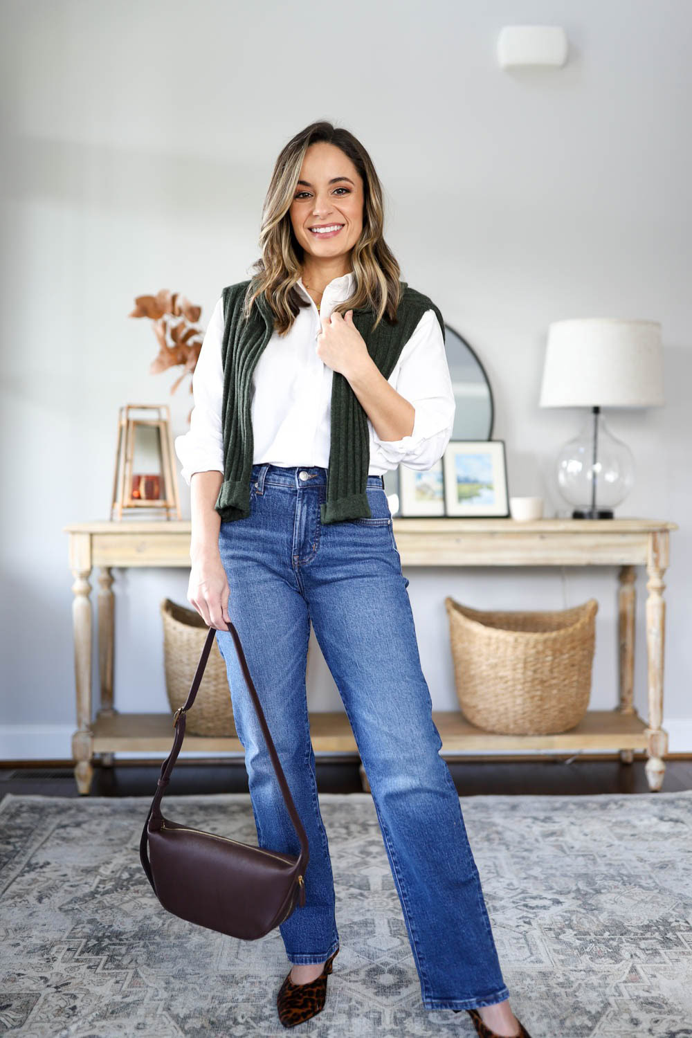 This ensemble perfectly embodies the cozy yet stylish essence of fall fashion. The forest green sweater vest layered over a crisp white button-down shirt creates a timeless, preppy look that’s both comfortable and chic. Paired with high-waisted straight-leg jeans, this outfit strikes the ideal balance between casual and put-together. The addition of a sleek brown leather shoulder bag adds a touch of sophistication, while leopard print flats introduce a playful element. This versatile combination is perfect for various autumn activities, from pumpkin picking to casual office days, ensuring you’ll turn heads while staying snug in the crisp fall air.
