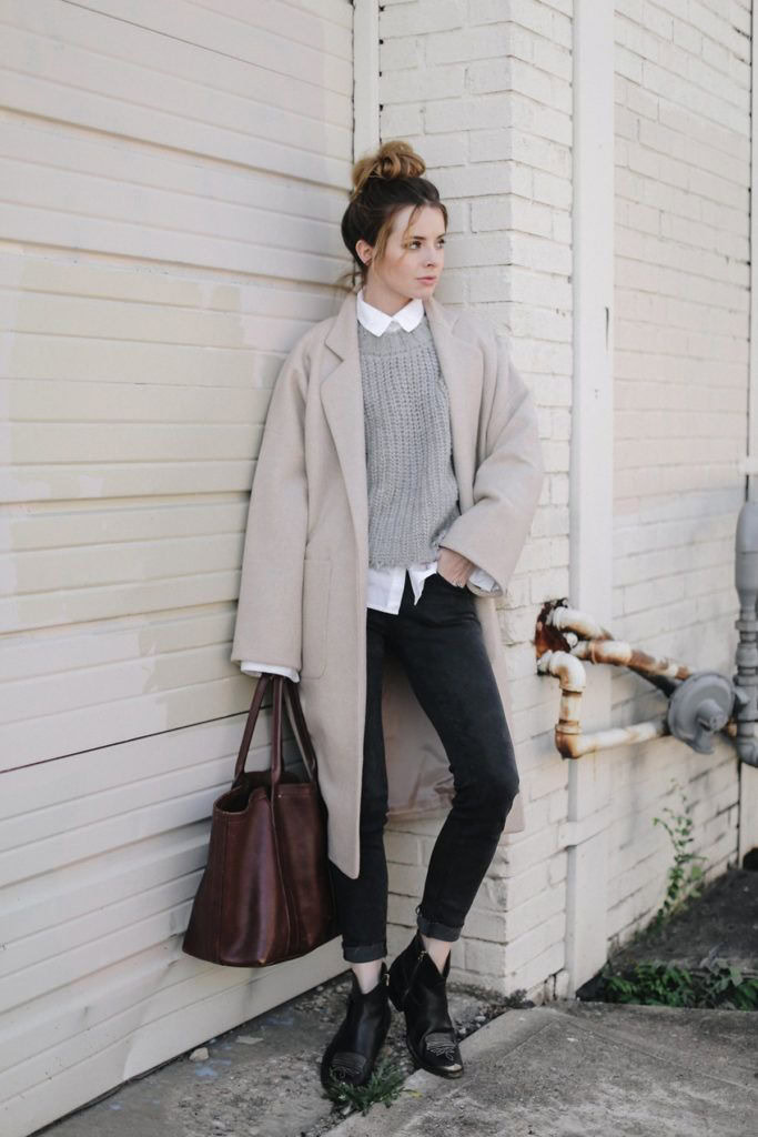 This ensemble epitomizes the perfect balance of sophistication and warmth for fall. The layered look starts with a crisp white collared shirt, adding a touch of polished refinement. Atop sits a chunky gray knit sweater, providing both texture and coziness. The piece de resistance is the oversized beige coat, which not only adds an extra layer of warmth but also elevates the entire outfit with its sleek, minimalist design. Dark skinny jeans and ankle boots complete the look, creating a slim silhouette that contrasts beautifully with the voluminous top layers. The rich brown leather tote adds a luxe touch, making this outfit perfect for both office and weekend outings. It’s a masterclass in layering that’s sure to turn heads while keeping you snug in the crisp autumn air.