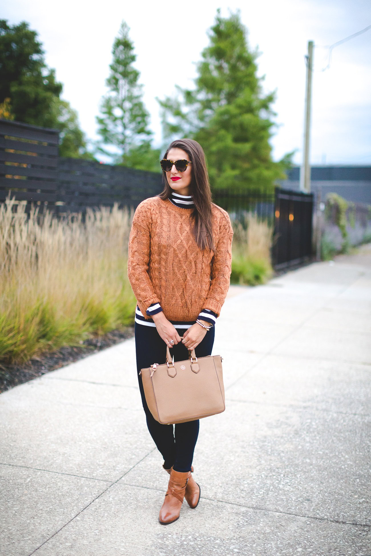 This ensemble perfectly embodies the cozy yet chic aesthetic of fall layering. The chunky cable-knit sweater in a warm caramel hue adds rich texture and comfort, while the striped turtleneck peeking out provides a sleek contrast and extra warmth. Dark skinny jeans and cognac ankle boots complete the look with a streamlined silhouette. The neutral tan handbag ties the color palette together, making this outfit versatile for various autumn occasions. Oversized sunglasses add a touch of glamour, demonstrating how layering can be both practical and stylish. This combination of textures, patterns, and autumnal colors is sure to turn heads while keeping you snug in the crisp fall air.