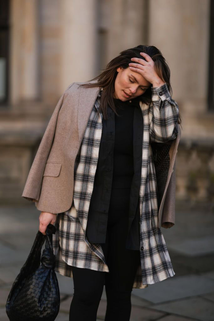 This ensemble perfectly embodies the cozy yet chic fall layering we all crave. A classic plaid button-up shirt serves as the foundation, paired with sleek black basics for a timeless look. The pièce de résistance is the luxurious camel coat draped effortlessly over the shoulders, adding a touch of sophistication and warmth. The mix of textures and neutral tones creates a visually interesting outfit that’s both comfortable and stylish. Accessorized with a woven leather tote, this look is ideal for transitioning from crisp autumn days to chilly evenings, proving that layering can be both practical and fashionable.