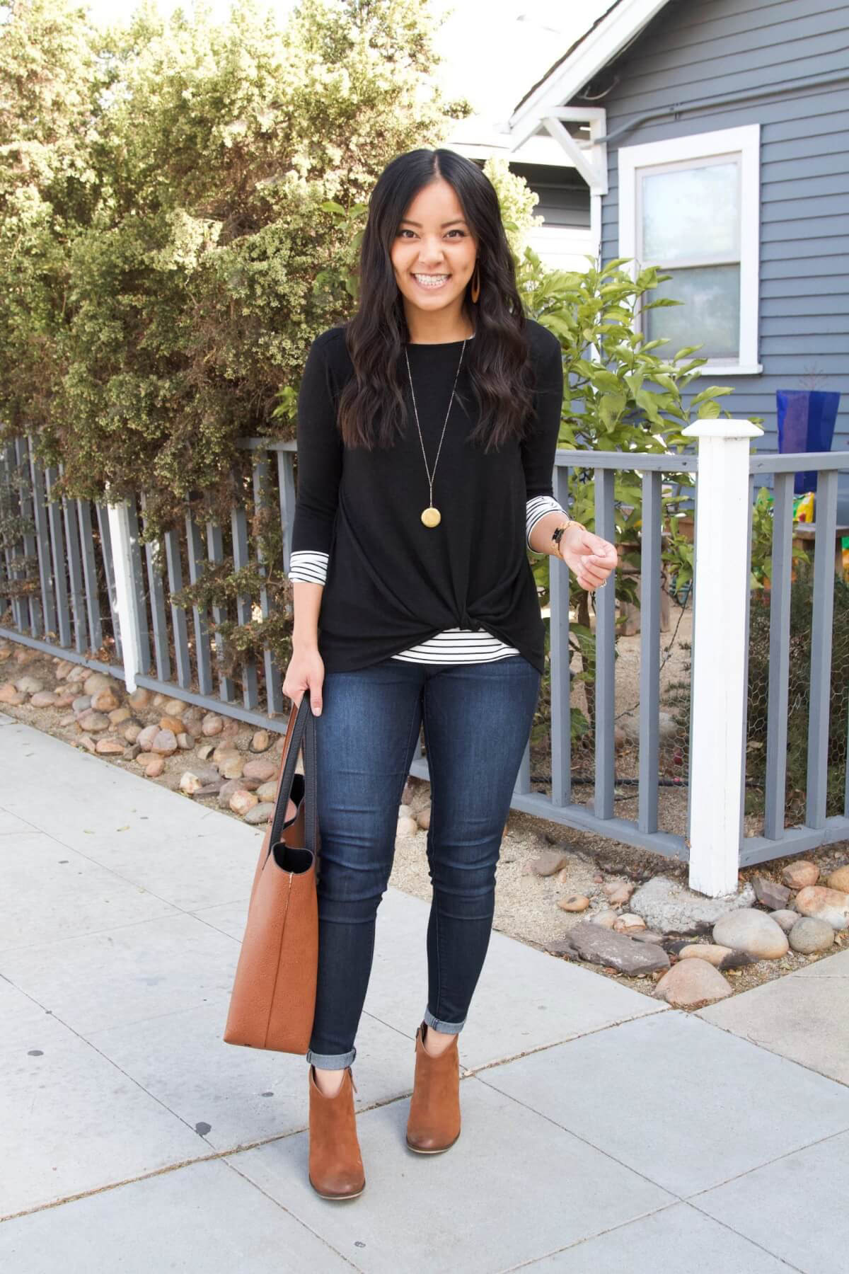 This ensemble exemplifies the perfect balance of comfort and style for fall. The black knotted sweater layered over a striped top creates visual interest and depth, while the fitted jeans and cognac ankle boots add a sleek silhouette. The long pendant necklace and matching earrings elevate the look with a touch of elegance. The cognac tote bag ties the outfit together, complementing the boots and adding a warm autumnal hue. This versatile combination is ideal for various occasions, from casual outings to office wear, making it a must-have in your fall wardrobe rotation. The layered approach allows for easy temperature adjustments throughout the day, ensuring you stay cozy and fashionable.