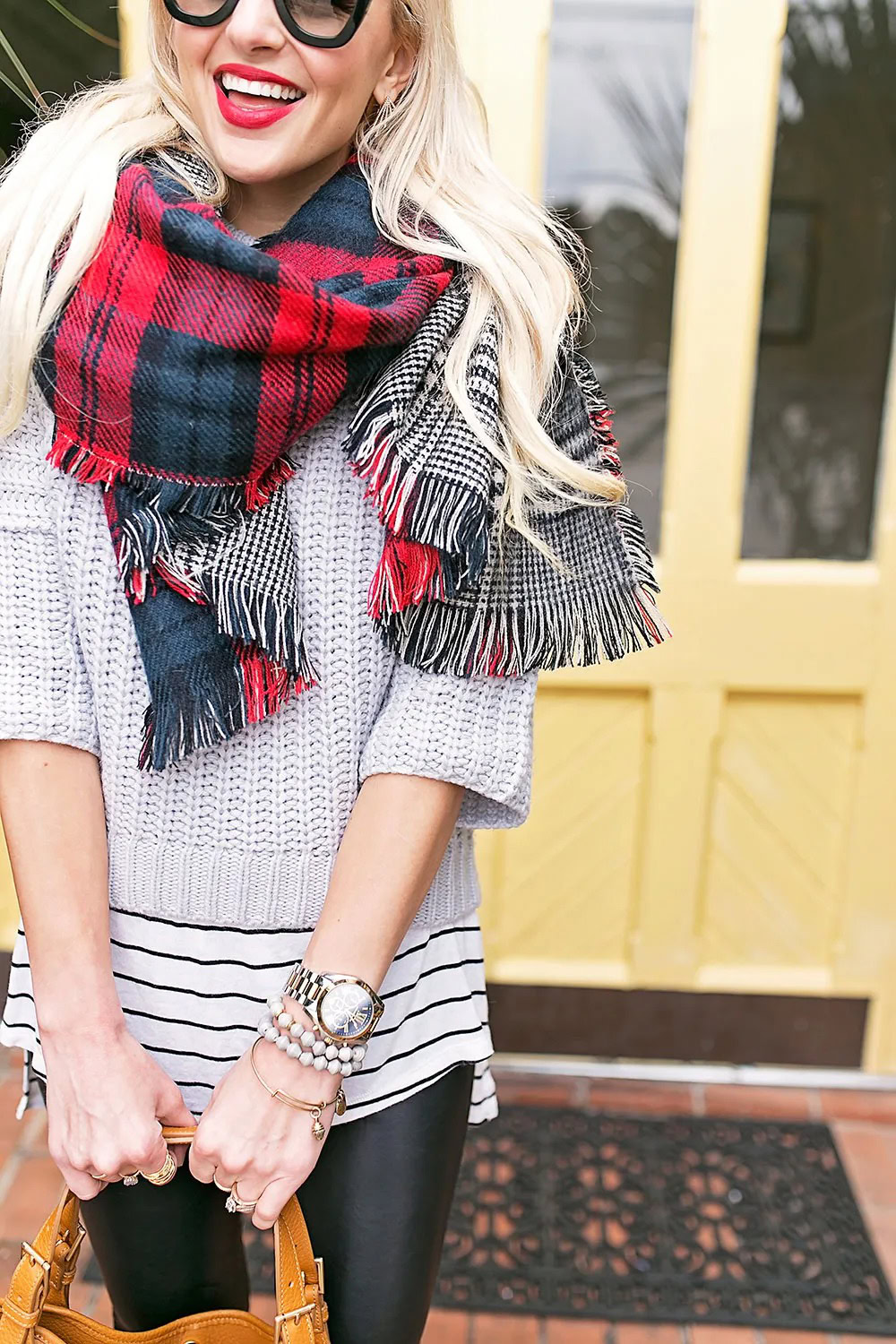 This eye-catching ensemble perfectly embodies the cozy layered look for fall. The focal point is a vibrant red and black plaid scarf with fringe details, adding a pop of color and pattern to the outfit. It’s draped over a chunky light gray knit sweater, creating a delightful textural contrast. The sweater is paired with a striped underlayer, showcasing the art of mixing patterns. Black leggings or pants complete the look, offering a sleek foundation for the upper layers. Accessorized with oversized sunglasses and statement jewelry, this outfit strikes the ideal balance between comfort and style, making it a standout choice for crisp autumn days.