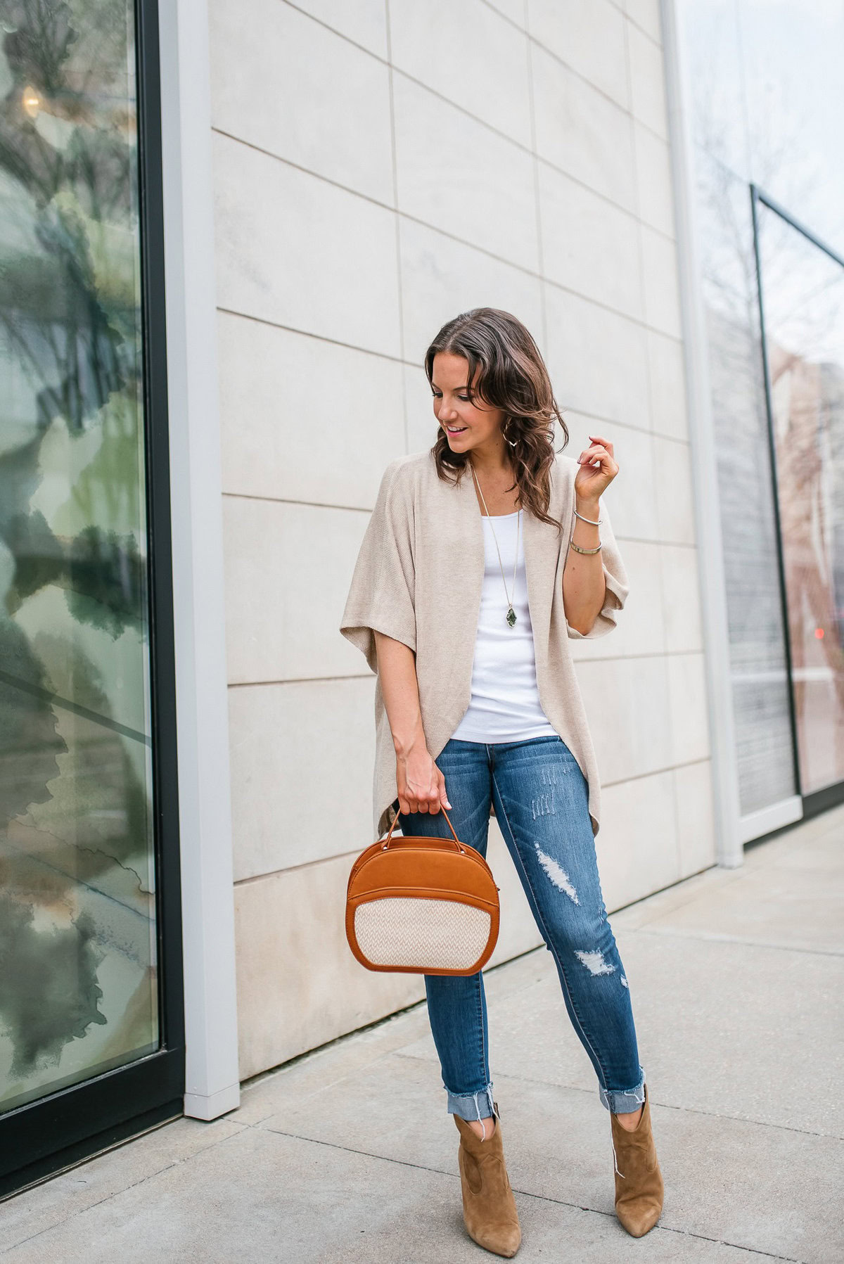This effortlessly stylish ensemble perfectly embodies the cozy yet fashionable spirit of fall layering. The outfit centers around a luxurious beige cardigan with wide, draped sleeves, providing both warmth and an air of sophistication. Paired with a crisp white tank top and distressed blue jeans, it strikes an ideal balance between comfort and style. The ensemble is elevated by cognac suede ankle boots and a matching round handbag, adding a touch of autumnal flair. A delicate pendant necklace completes the look, demonstrating how accessories can enhance a layered outfit without overwhelming it. This combination is versatile enough for various fall activities while ensuring you’ll turn heads with its polished, put-together appearance.