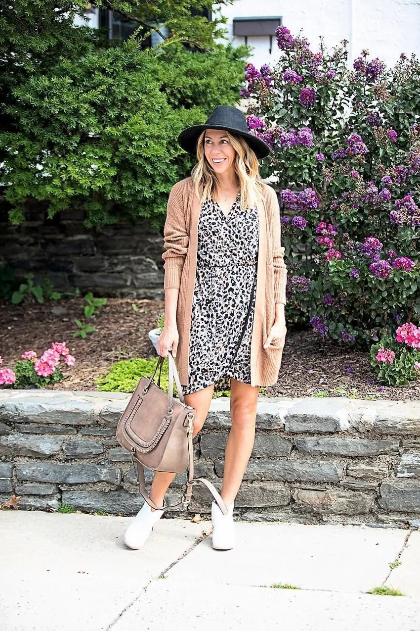 This ensemble perfectly embodies the cozy yet chic aesthetic of fall fashion. The lightweight leopard print dress serves as a versatile base, while the long camel cardigan adds warmth and sophistication. The contrast between the wild print and the neutral sweater creates visual interest without overwhelming the eye. Accessorized with a wide-brimmed black hat, neutral tote, and white sneakers, this outfit strikes the ideal balance between comfort and style. It’s a prime example of how layering can elevate a simple dress into a head-turning autumn look that’s suitable for various occasions, from casual outings to more dressed-up events.