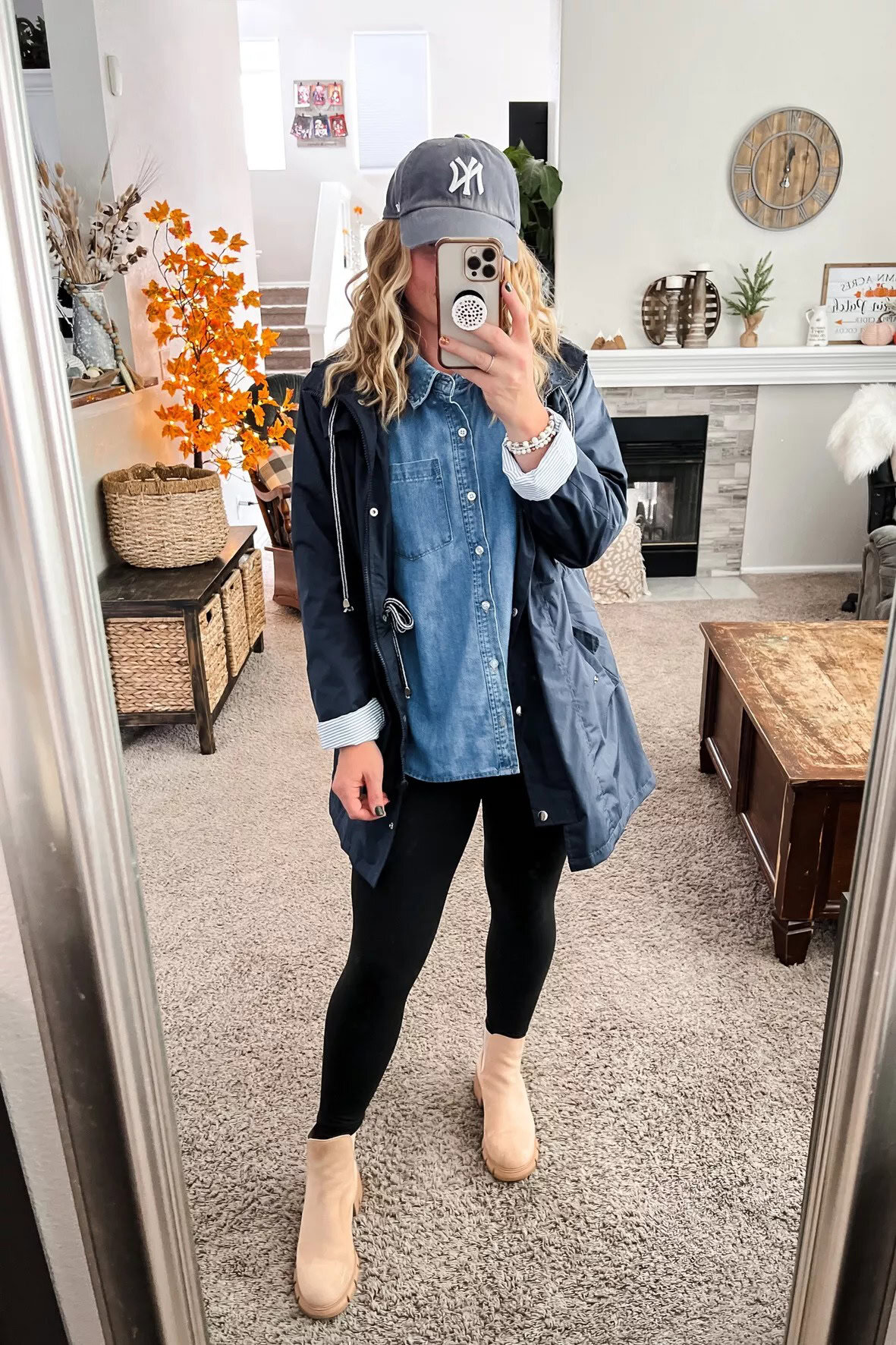 This effortlessly stylish ensemble perfectly embodies the cozy layered look for fall. The outfit centers around a classic denim shirt, expertly paired with a navy outer layer for a sophisticated color palette. Black leggings provide a sleek foundation, while neutral ankle boots add a touch of warmth. The baseball cap introduces a sporty element, making this look ideal for a range of casual autumn activities. What sets this outfit apart is its versatility and comfort, allowing for easy transitions from errands to informal gatherings. The layers provide both style and practicality, ensuring you stay warm and fashionable as the temperatures drop.