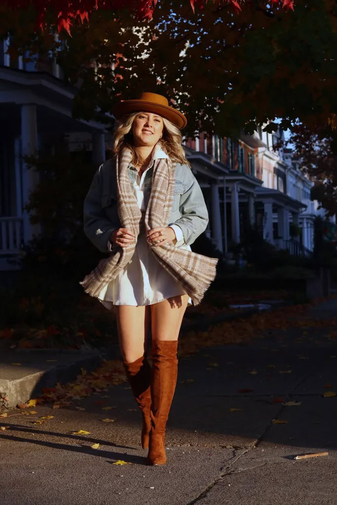 This ensemble epitomizes the perfect balance of cozy and chic for fall. The combination of a light denim jacket layered over a crisp white shirt dress creates a fresh, airy base, while the plaid scarf adds warmth and texture. The standout knee-high boots in rich caramel leather bring a touch of rustic elegance, perfectly complemented by the wide-brimmed hat. This outfit seamlessly blends urban sophistication with countryside charm, making it ideal for both city streets and autumn getaways. The layered approach not only provides versatility for changing temperatures but also creates visual interest, ensuring you’ll turn heads wherever your fall adventures take you.