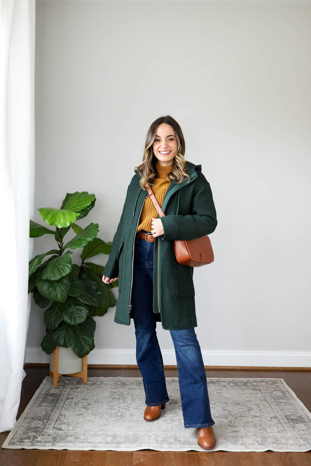 This ensemble perfectly captures the essence of cozy fall layering while maintaining a polished and eye-catching appearance. The forest green hooded coat serves as a stunning outer layer, providing both warmth and style. Underneath, a rich mustard turtleneck sweater adds a pop of autumnal color, creating a beautiful contrast against the deep green. Classic blue jeans and brown leather accessories, including boots and a crossbody bag, complete the look with timeless appeal. This outfit demonstrates how to effortlessly combine textures and autumn hues for a sophisticated yet comfortable style that’s sure to turn heads. The layered approach allows for easy adaptation to changing temperatures, making it an ideal choice for unpredictable fall weather.