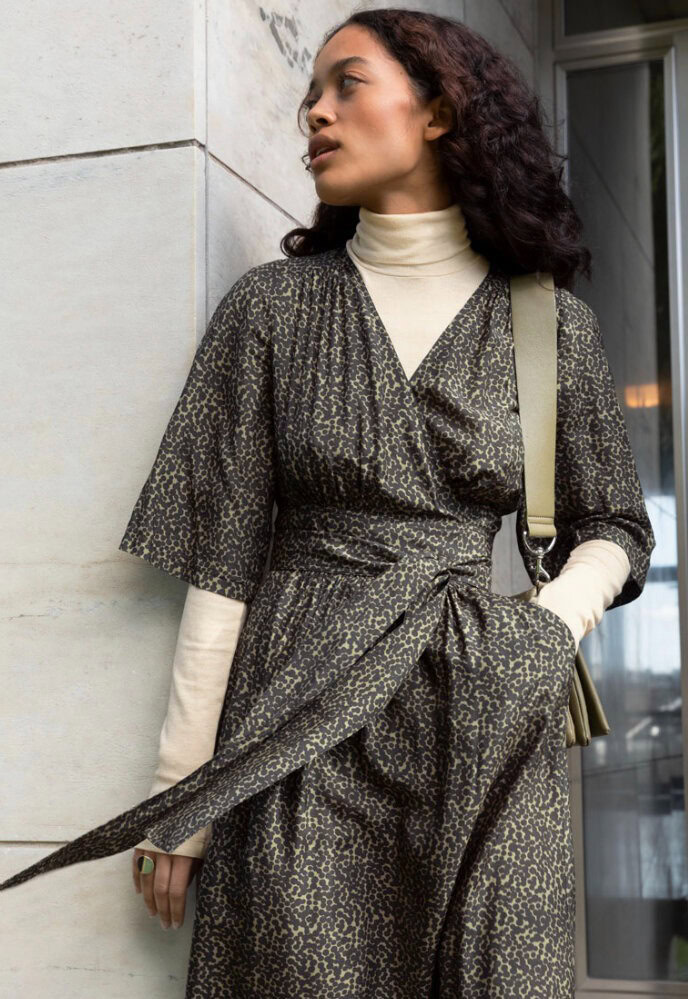 Elevate your fall wardrobe with this sophisticated leopard print wrap dress layered over a cozy cream turtleneck. The kimono-style sleeves and cinched waist create a flattering silhouette, while the animal print adds a touch of wild elegance to your autumn look. The contrasting textures of the smooth undershirt and the patterned dress offer both warmth and style. Accessorized with a neutral shoulder bag, this outfit strikes the perfect balance between comfort and fashion-forward appeal. It’s an ideal choice for those crisp fall days when you want to make a statement without sacrificing coziness.