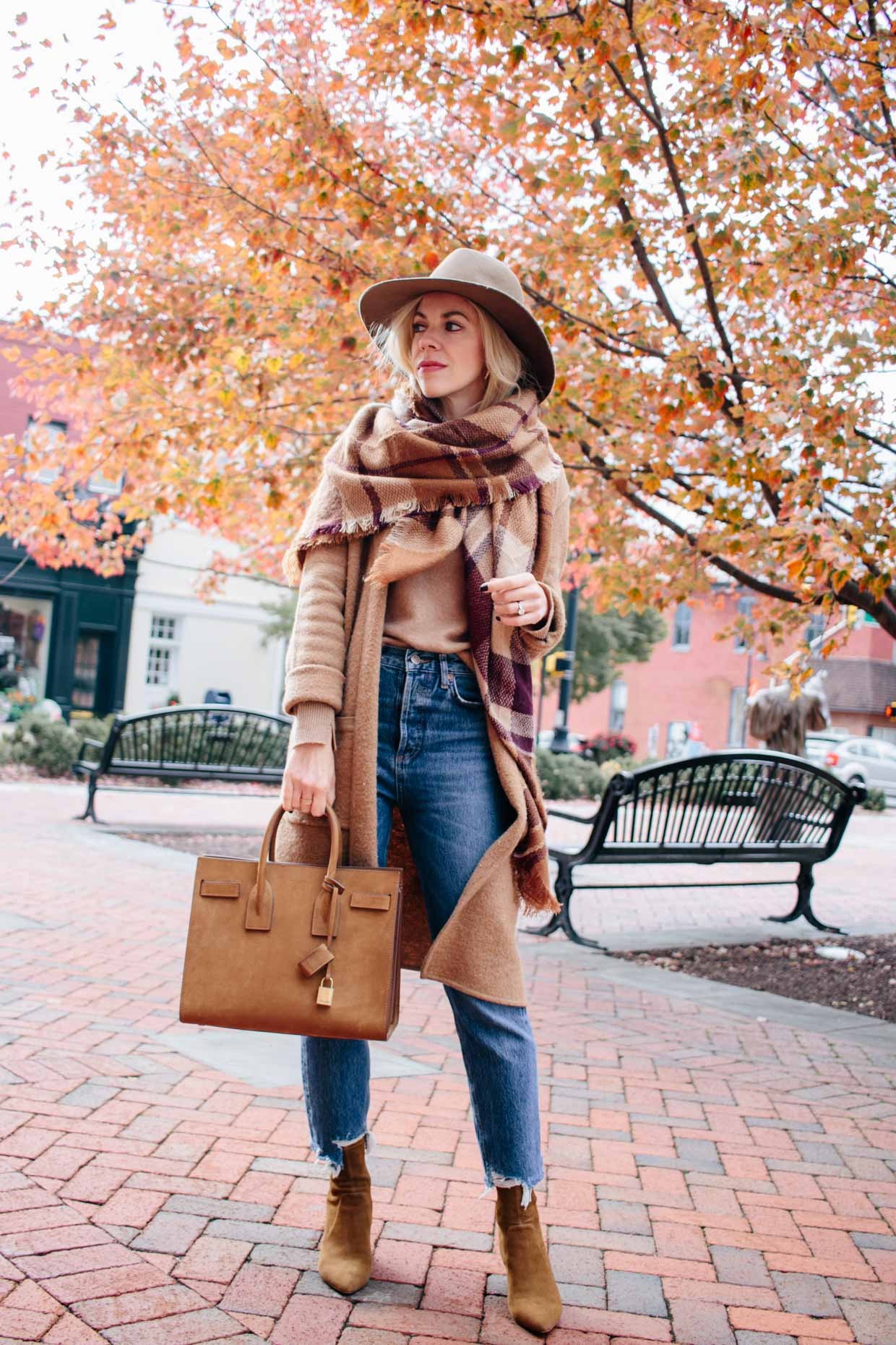 This ensemble perfectly captures the essence of cozy fall fashion while maintaining a polished, head-turning look. The outfit centers around a luxurious camel-colored coat, which adds warmth and sophistication. Layered underneath is a soft sweater in a complementary neutral tone, creating depth and texture. The plaid scarf introduces a pop of pattern and additional coziness, while distressed jeans add a casual, modern edge. Accessories like the wide-brimmed hat and structured leather tote elevate the outfit, making it suitable for both casual outings and more formal autumn occasions. The harmonious color palette of warm neutrals ties the look together, echoing the beautiful fall foliage in the background.