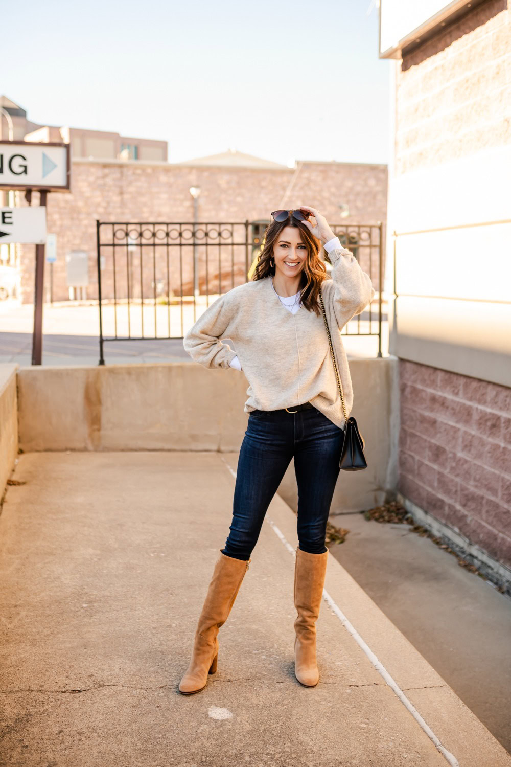 This ensemble perfectly embodies the essence of fall fashion with its effortlessly chic layering. The oversized beige sweater exudes comfort and warmth, while the crisp white shirt peeking out adds a touch of polish. Paired with sleek dark-wash jeans and knee-high tan boots, this outfit strikes the ideal balance between cozy and stylish. The chunky sweater’s relaxed fit allows for easy layering, making it a versatile piece for unpredictable autumn weather. Accessorized with a small black crossbody bag and sunglasses perched atop her head, this look is both practical and fashionable. It’s a prime example of how layering can create a head-turning fall outfit that’s perfect for everything from casual outings to weekend brunches.