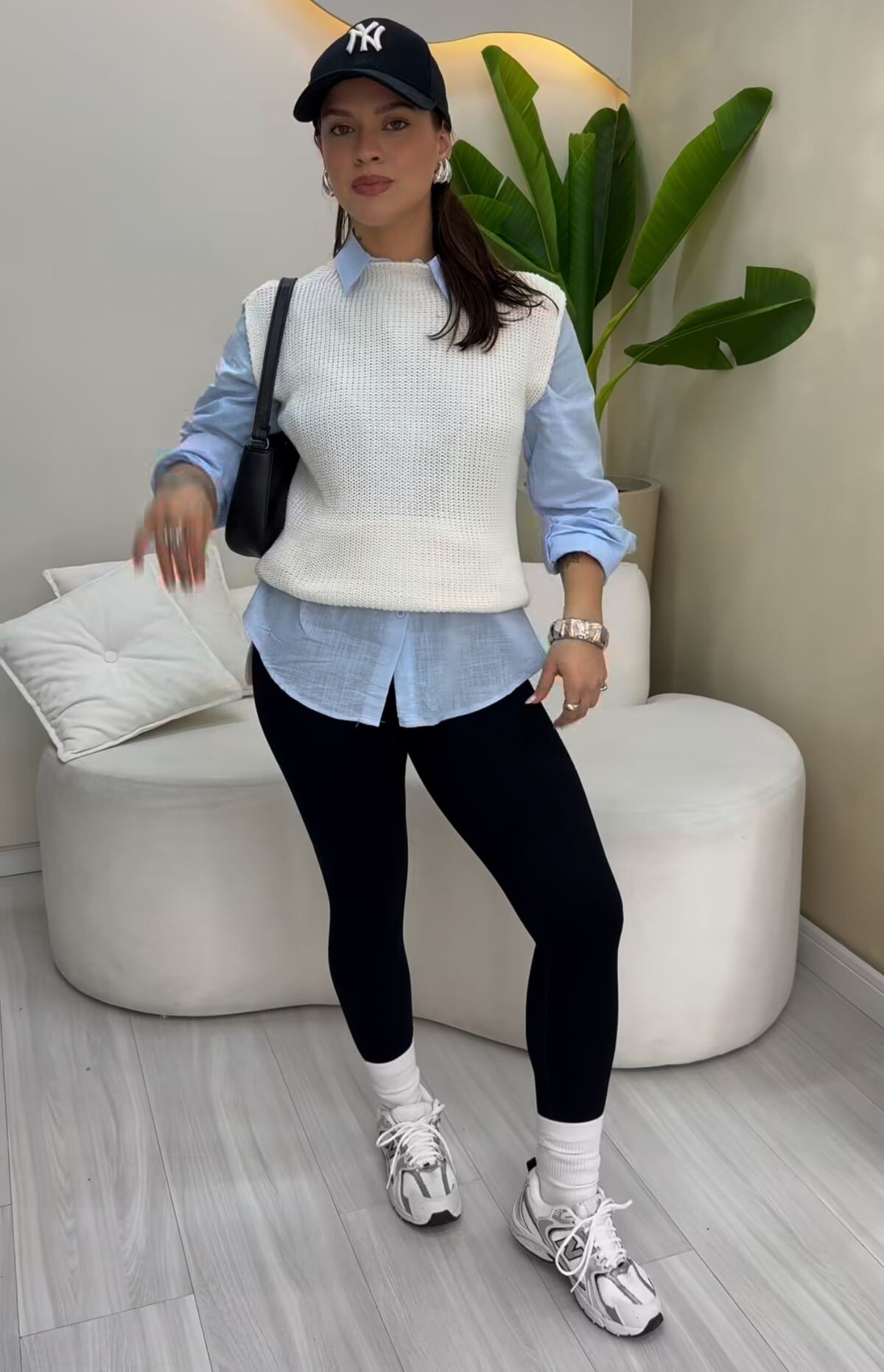 Black leggings and white sneakers keep the look modern and sporty, while the team baseball cap adds spirit to your game day attire. The lightweight cross-body bag keeps your essentials accessible, and the overall aesthetic maintains that polished, put-together appearance even in cold weather.