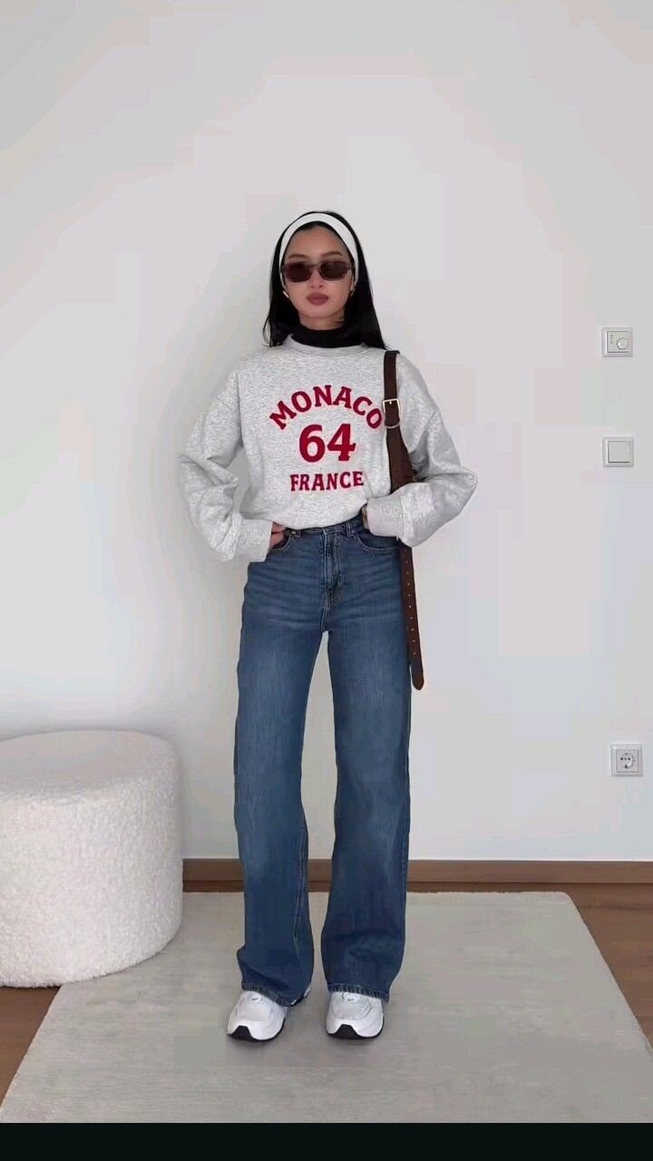This casual athletic-inspired look perfectly balances comfort and style for gameday excitement. The oversized gray graphic sweatshirt provides excellent insulation while the vintage-wash wide-leg jeans offer both warmth and a relaxed silhouette.