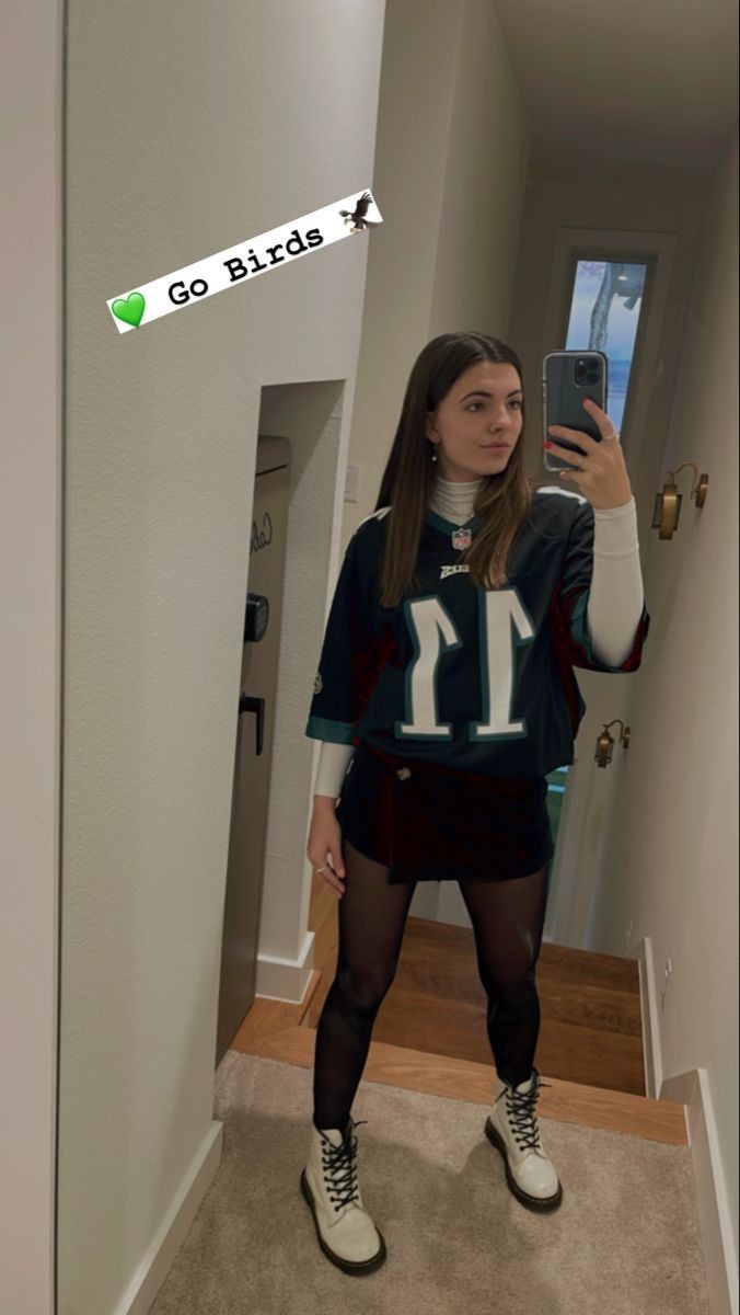 Paired with crisp white knee-high boots, this look transitions seamlessly from tailgate to stadium seating while maintaining warmth and style. The jersey”s length provides extra coverage and insulation, while the boots offer both protection from cold ground and an elevated aesthetic that works whether you”re standing in the stands or celebrating a victory.