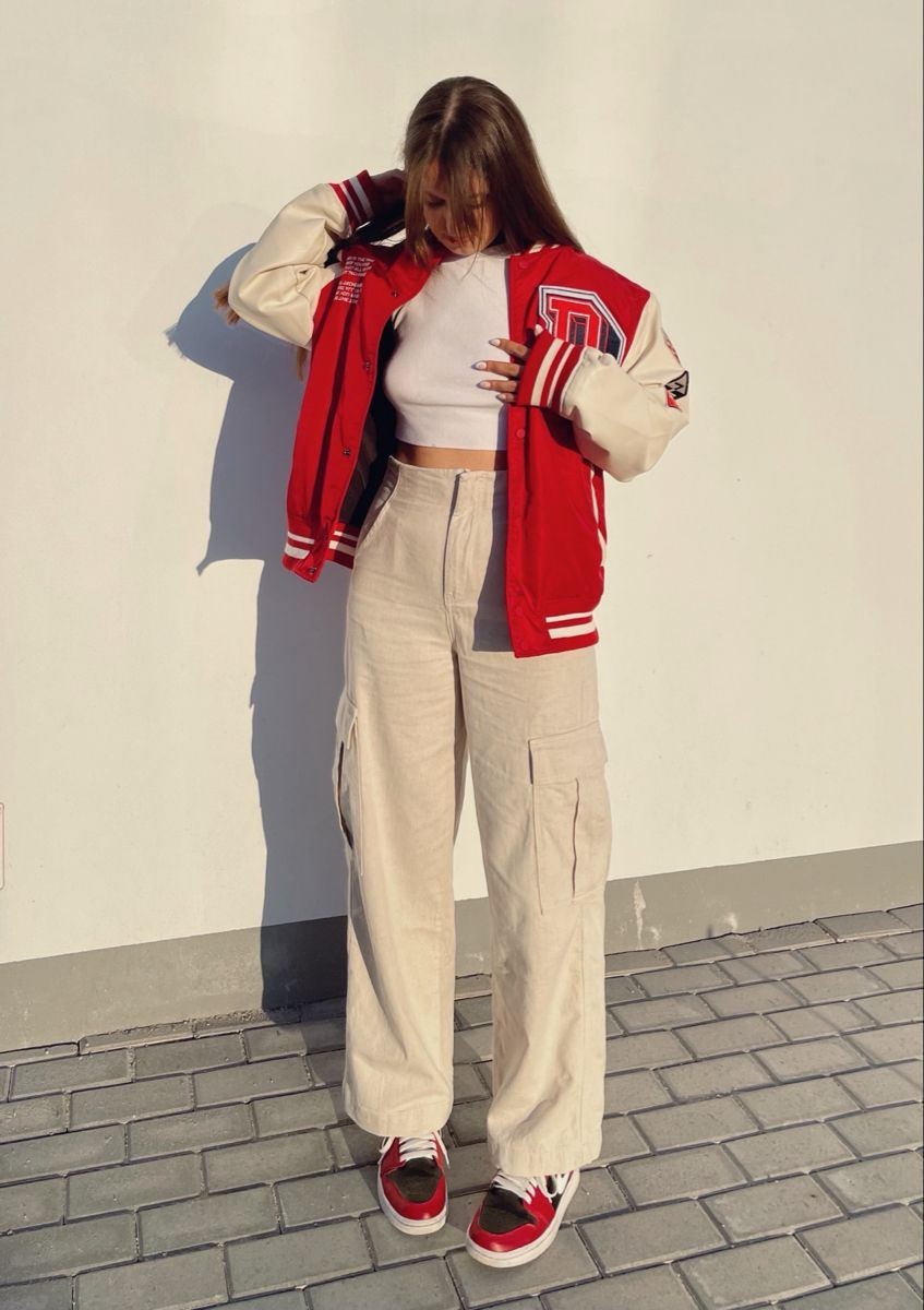 Paired with neutral cream cargo pants and coordinating red sneakers, this ensemble offers both warmth and visual appeal. The layered look with a fitted white crop top underneath allows for temperature adjustability throughout the game, while the structured jacket silhouette flatters any body type.