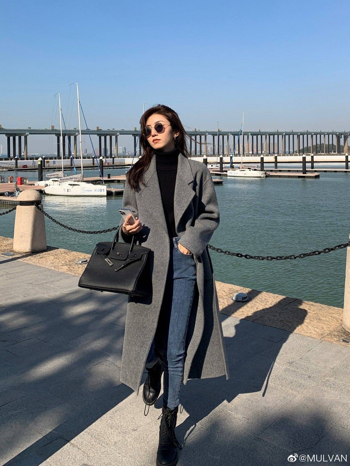This timeless ensemble perfectly captures sophisticated winter style while delivering exceptional warmth. The oversized gray wool coat serves as an elegant foundation piece that pairs beautifully with a black turtleneck and fitted denim, creating a chic monochromatic base that works for both casual outings and urban adventures.