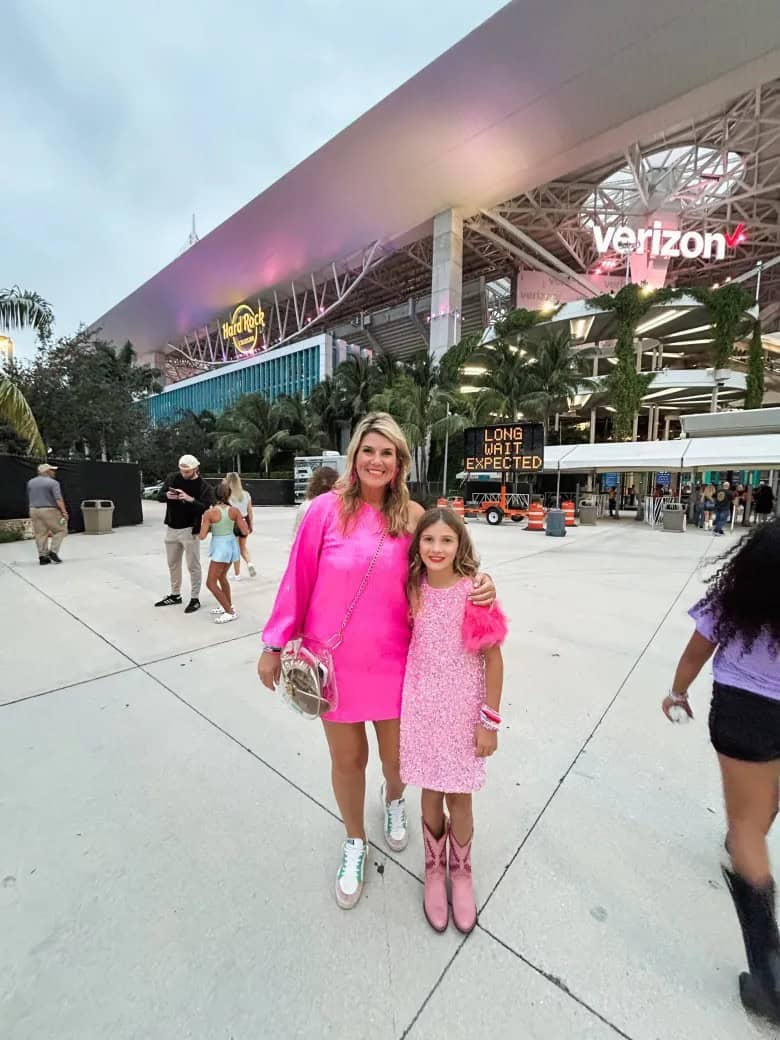 Pair it with metallic accessories and comfortable sneakers for a stylish yet practical concert outfit. The matching pink dress on the younger companion showcases how this look can be adapted for all ages, making it ideal for family concert outings or matching with friends.