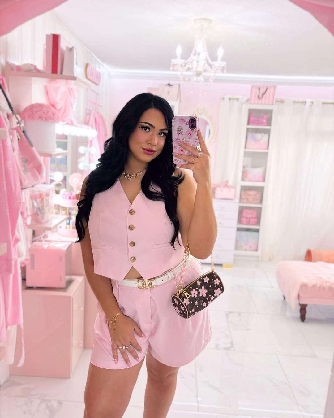 The outfit is elevated with coordinating pink accessories, including a floral-embroidered handbag and a delicate headband. A pearl necklace adds a touch of elegance, while the ice cream cone in hand brings a playful element to the look.