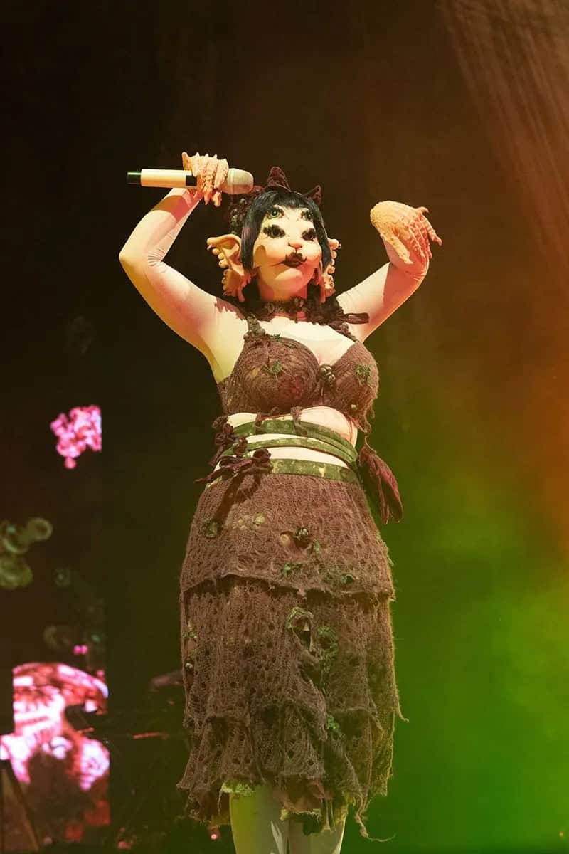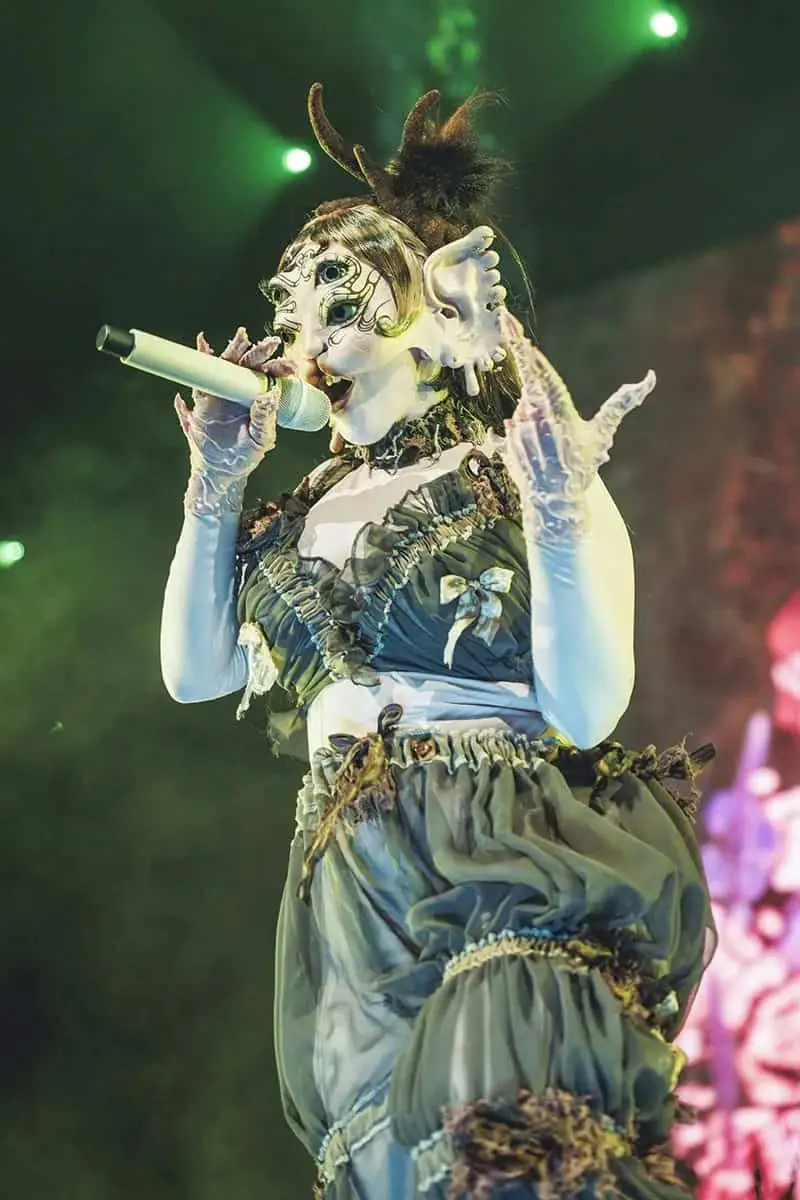 Topped with a delicate flower crown and paired with edgy platform sandals, this outfit seamlessly blends ethereal charm with a hint of gothic allure. Its an ideal choice for fans looking to embody the imaginative spirit of Melanies music while making a striking visual statement at her concert.