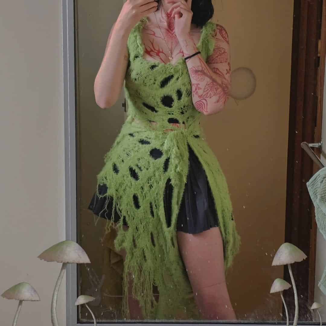 Channel your inner woodland sprite with this enchanting green fairy dress. The vibrant lime hue and delicate, frayed texture create an ethereal look thats perfect for a Melanie Martinez concert.