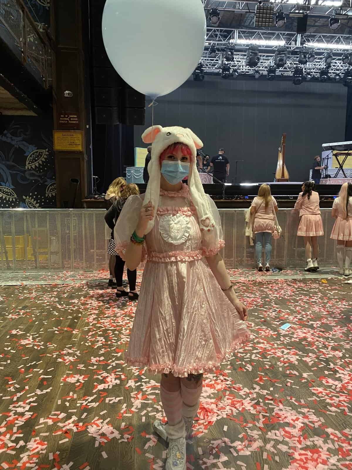 The playful bunny ear hat adds an extra layer of whimsy, while the oversized balloon brings a touch of surrealism to the ensemble. The look is completed with cozy boots and a face mask, demonstrating how fans can adapt Martinezs style for real-world events.