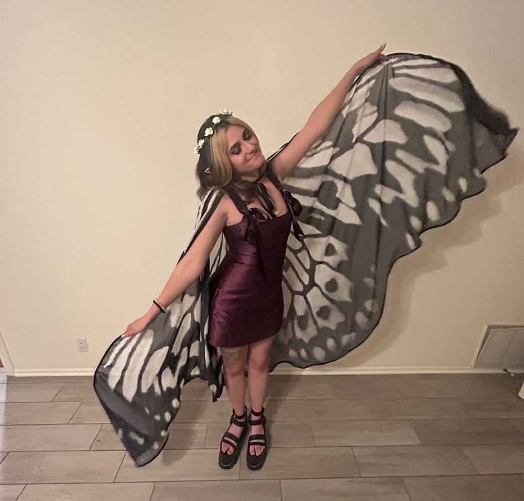 Transform into a whimsical butterfly with this enchanting ensemble that perfectly captures Melanie Martinezs dreamy aesthetic. The plum-colored mini dress serves as a rich, velvety base, while the showstopping black and white butterfly wings add a magical touch of fantasy.