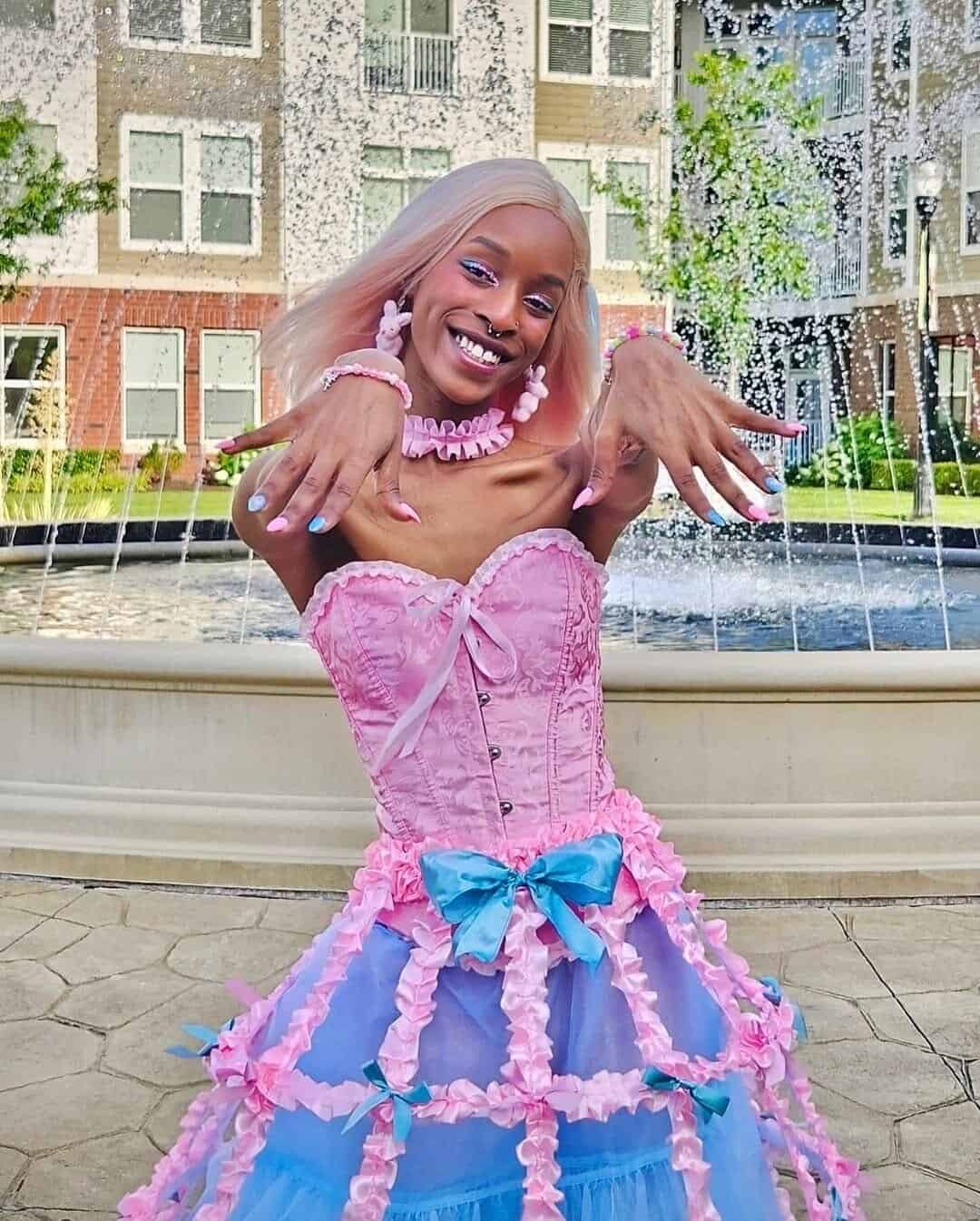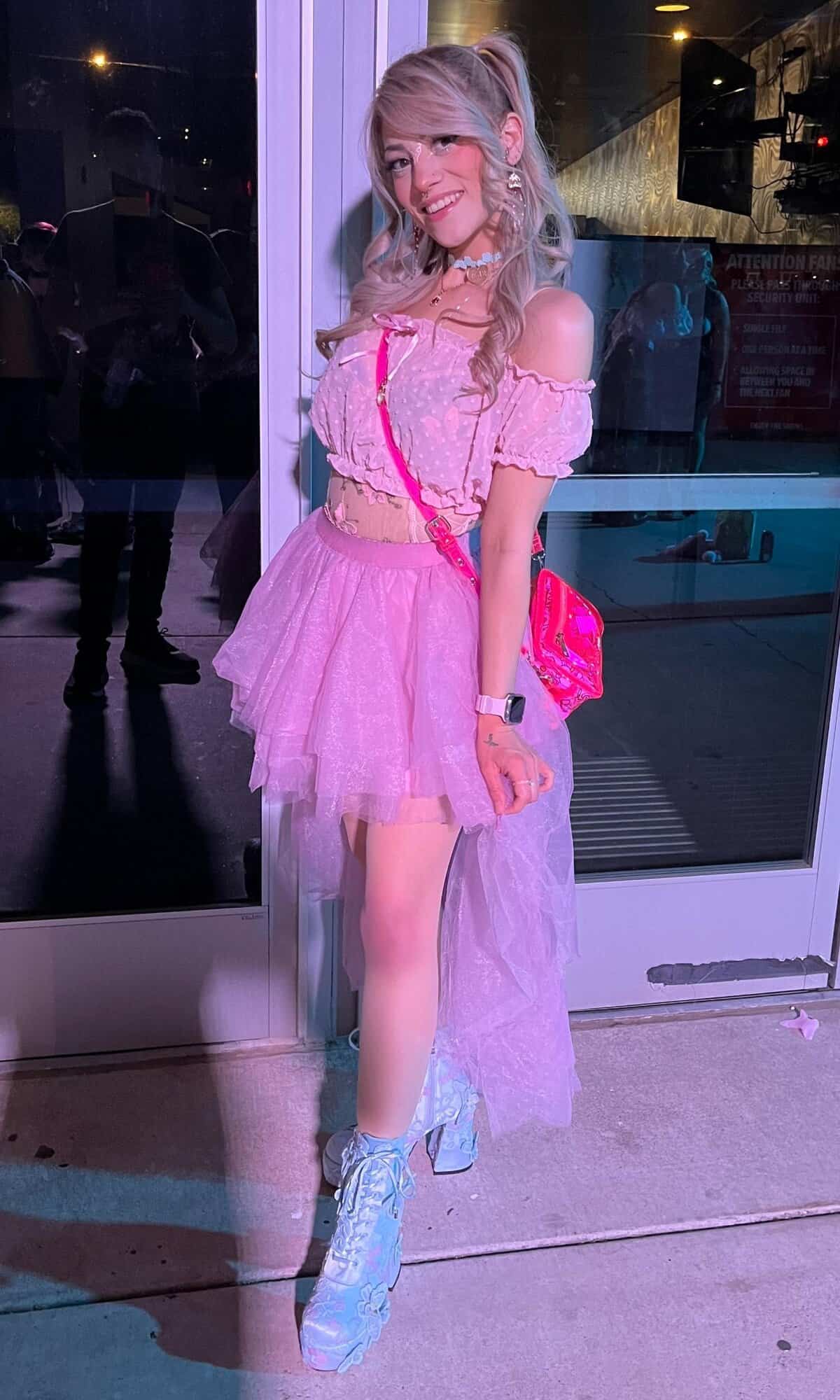 This enchanting outfit perfectly captures Melanie Martinezs signature blend of childlike wonder and edgy pop aesthetics. The pastel pink dress with frilly details and a heart-shaped embellishment creates a dreamy, doll-like appearance.