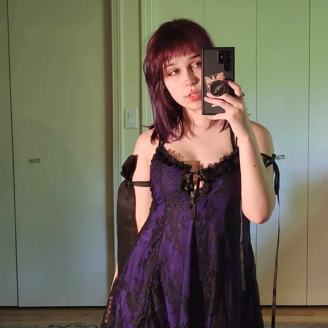 Channel your inner Crybaby with this enchanting purple lace slip dress. The deep violet hue and delicate black lace overlay create a dreamy, romantic aesthetic that perfectly captures Melanie Martinezs signature style.