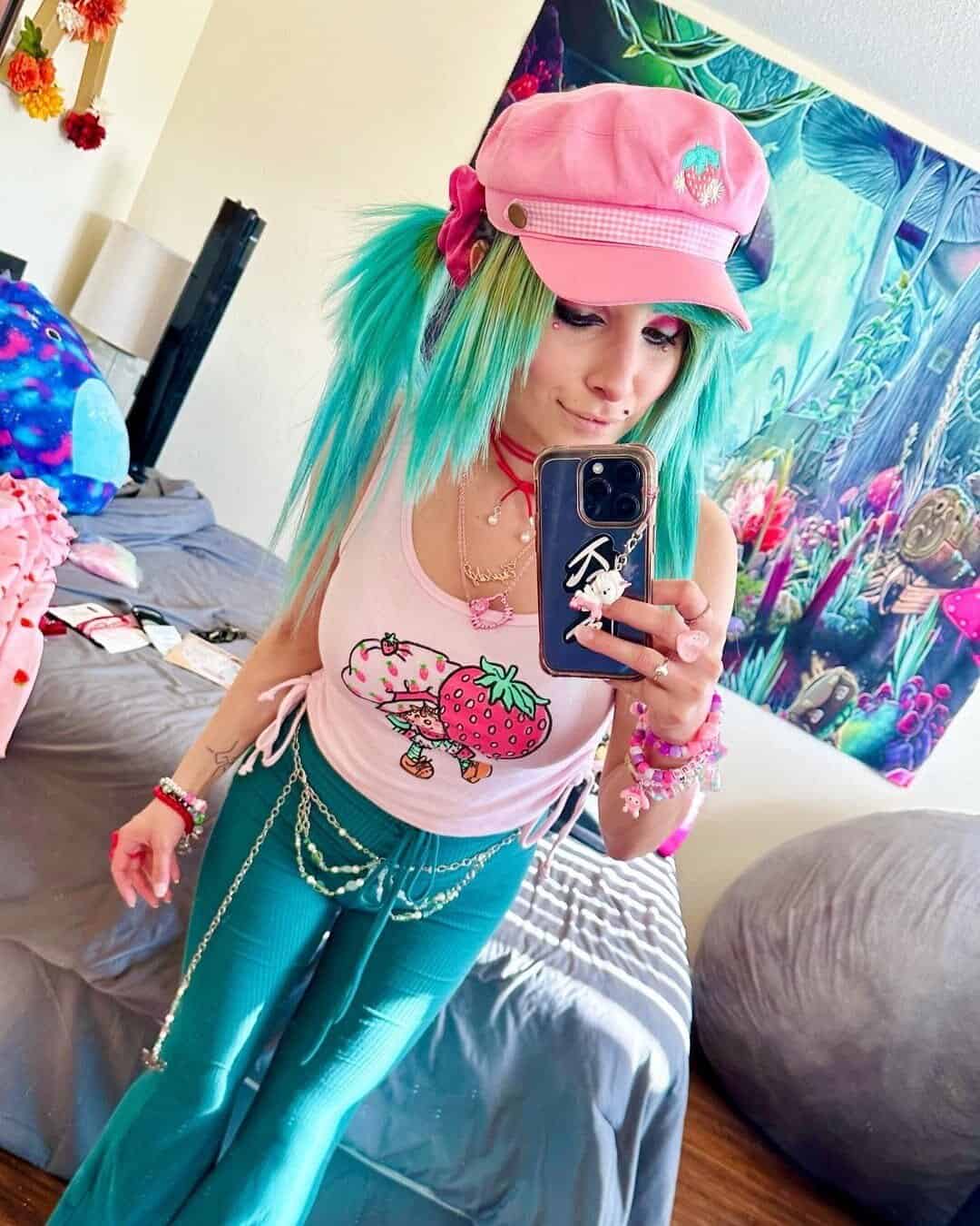 The pastel pink tank top featuring a whimsical strawberry character graphic is a nod to Melanies love for childlike imagery. Paired with vibrant teal pants and an array of colorful accessories, including chain belts and beaded bracelets, this ensemble embodies the Crybaby aesthetic.