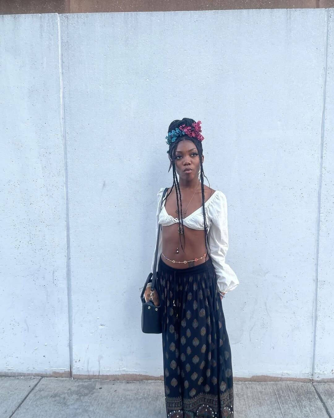 Channel your inner flower child with this dreamy bohemian-inspired outfit. The combination of a white crop top with puff sleeves and a flowing patterned maxi skirt creates a perfect balance of whimsy and elegance.