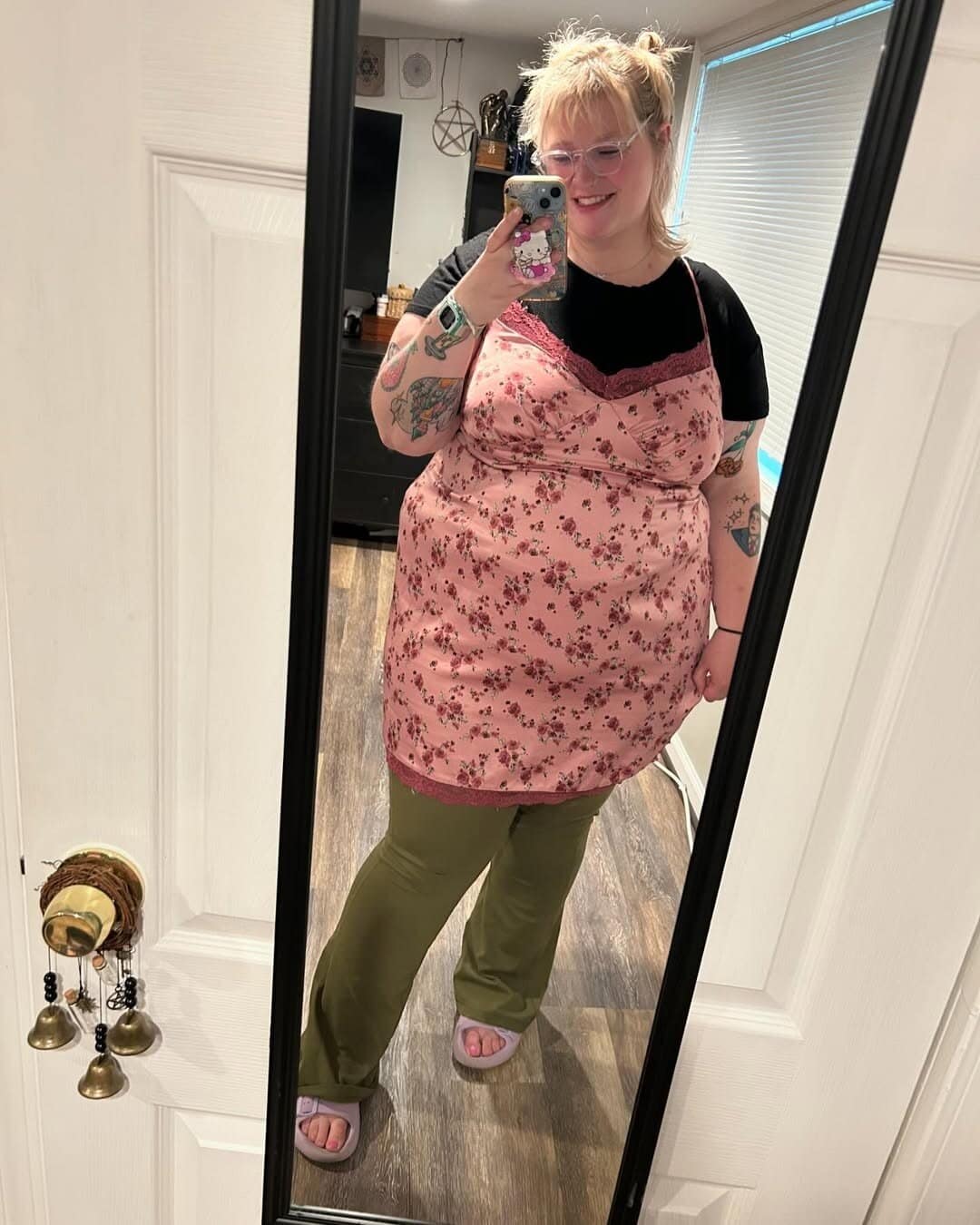 Channel your inner Crybaby with this delightful blend of sweet and edgy. The pink floral camisole adds a touch of Melanie Martinezs signature whimsy, while the olive green pants provide a grounding contrast.