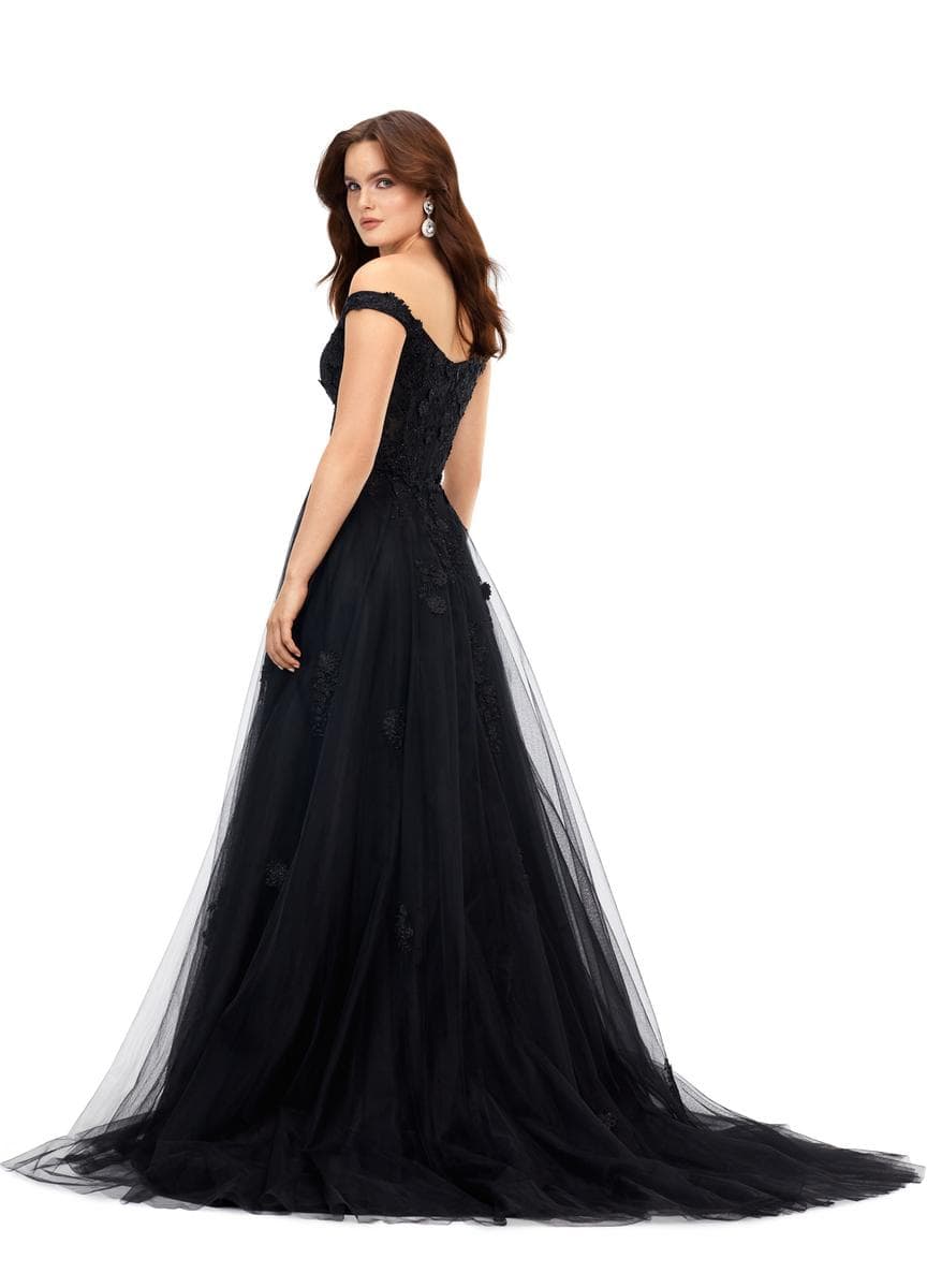 This enchanting black tulle off-shoulder gown redefines cozy chic for prom night. The flowy, ethereal silhouette provides unrestricted movement, allowing you to dance the night away in supreme comfort.