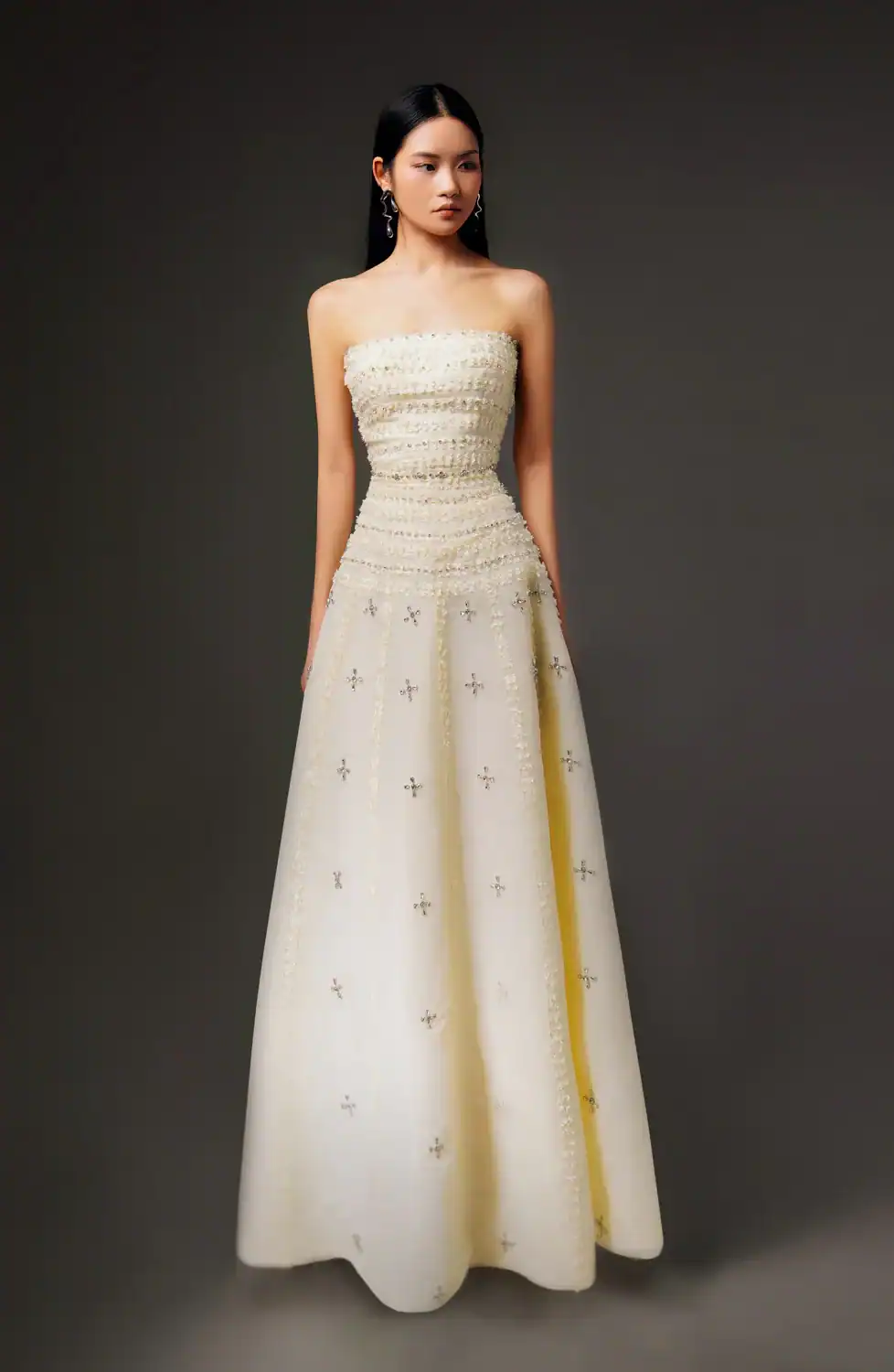 The full skirt creates a dreamy effect, perfect for twirling on the dance floor. Despite its formal appearance, the gown’s soft tulle fabric ensures a gentle, cloud-like sensation against the skin, proving that glamour and comfort can indeed coexist in perfect harmony.