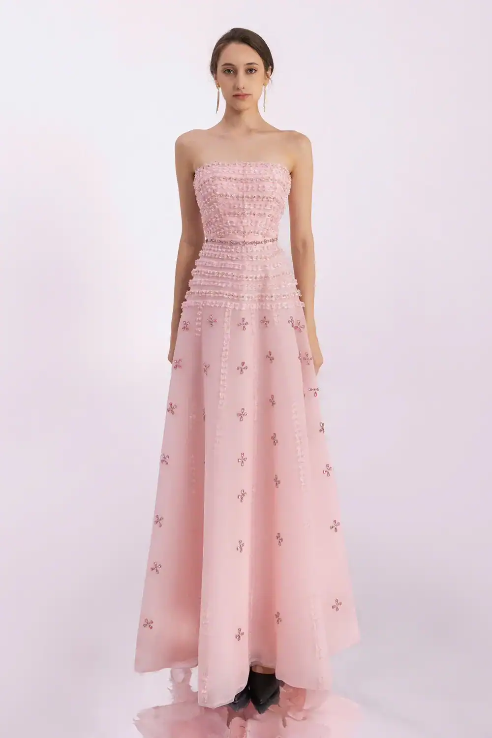 This enchanting blush pink ball gown epitomizes cozy chic with its soft, dreamy tulle skirt and delicate floral embellishments. The gown’s bodice features intricate 3D floral appliqués in matching pink tones, creating a romantic and textured look.