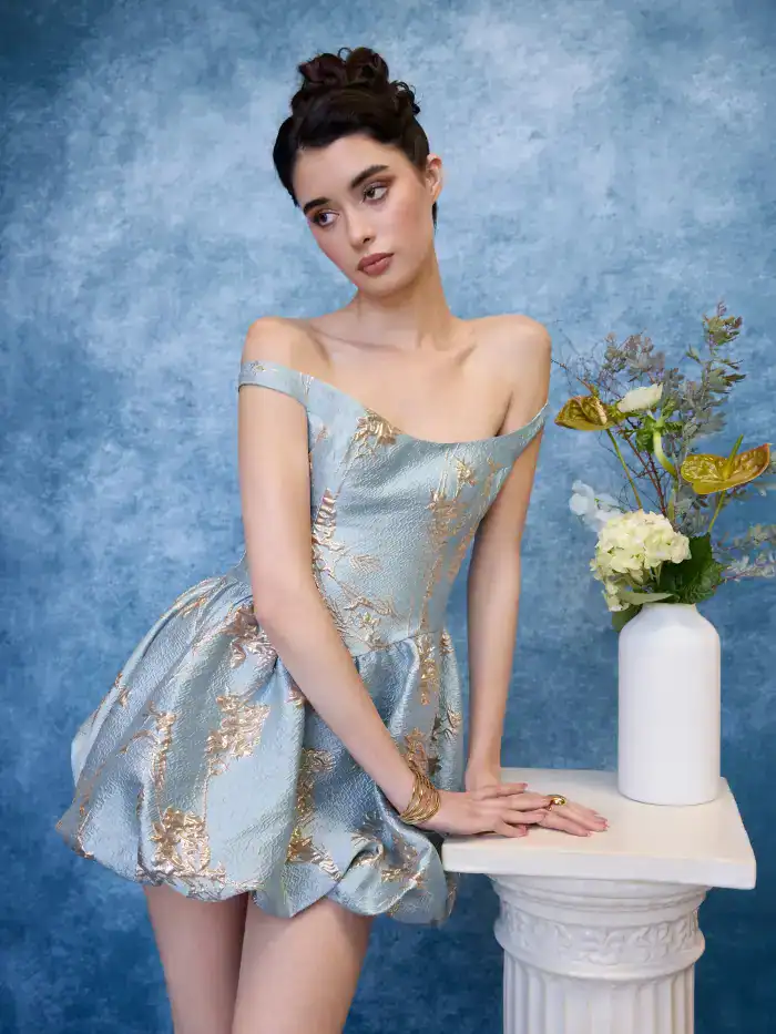 The off-shoulder design and bubble skirt silhouette offer a perfect balance of comfort and style, allowing for easy movement on the dance floor. The dress’s shorter length ensures you won’t be tripping over yards of fabric, making it ideal for a night of celebration.