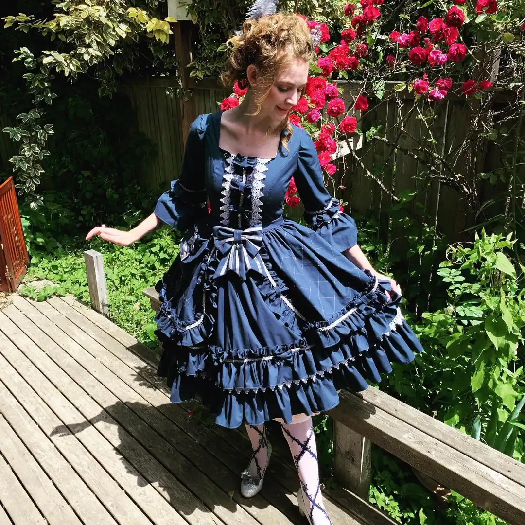 For the prom-goer seeking both comfort and unique style, this vintage-inspired Lolita dress offers a delightful twist on cozy chic. The navy blue fabric provides a rich backdrop for intricate white lace detailing, creating a harmonious blend of elegance and whimsy.