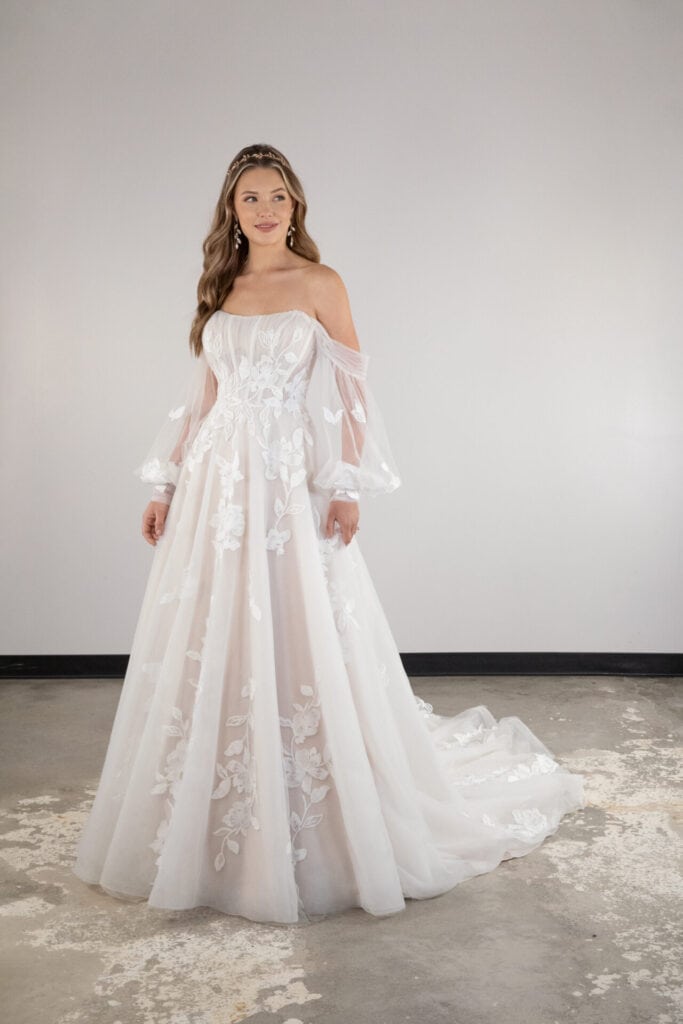 This stunning off-shoulder gown redefines cozy chic for prom with its dreamy silhouette and delicate floral embroidery. The billowing sheer sleeves add a touch of whimsy while ensuring comfort throughout the night.