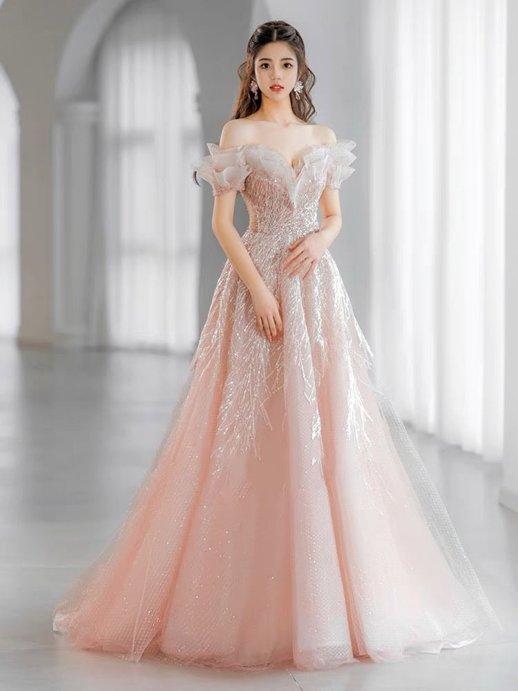 This breathtaking off-shoulder gown embodies the perfect blend of comfort and elegance for your dream prom night. The soft pink hue exudes a romantic, dreamy vibe while the sparkly embellishments add a touch of glamour.