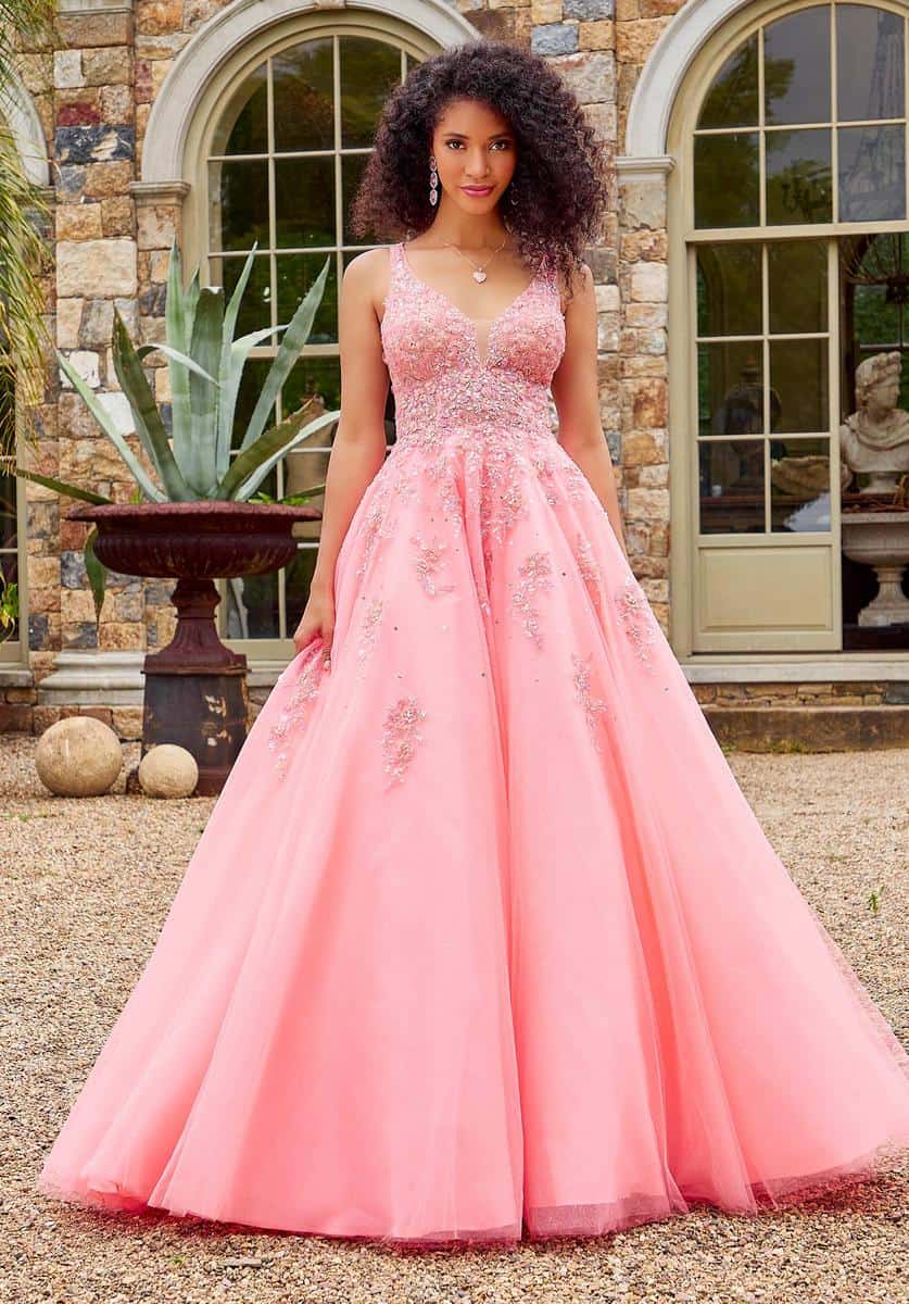 The gown’s rosy hue exudes warmth and femininity, perfect for a dreamy prom night. Its flattering V-neckline and sleeveless design strike an ideal balance between elegance and ease, allowing for unrestricted movement on the dance floor.