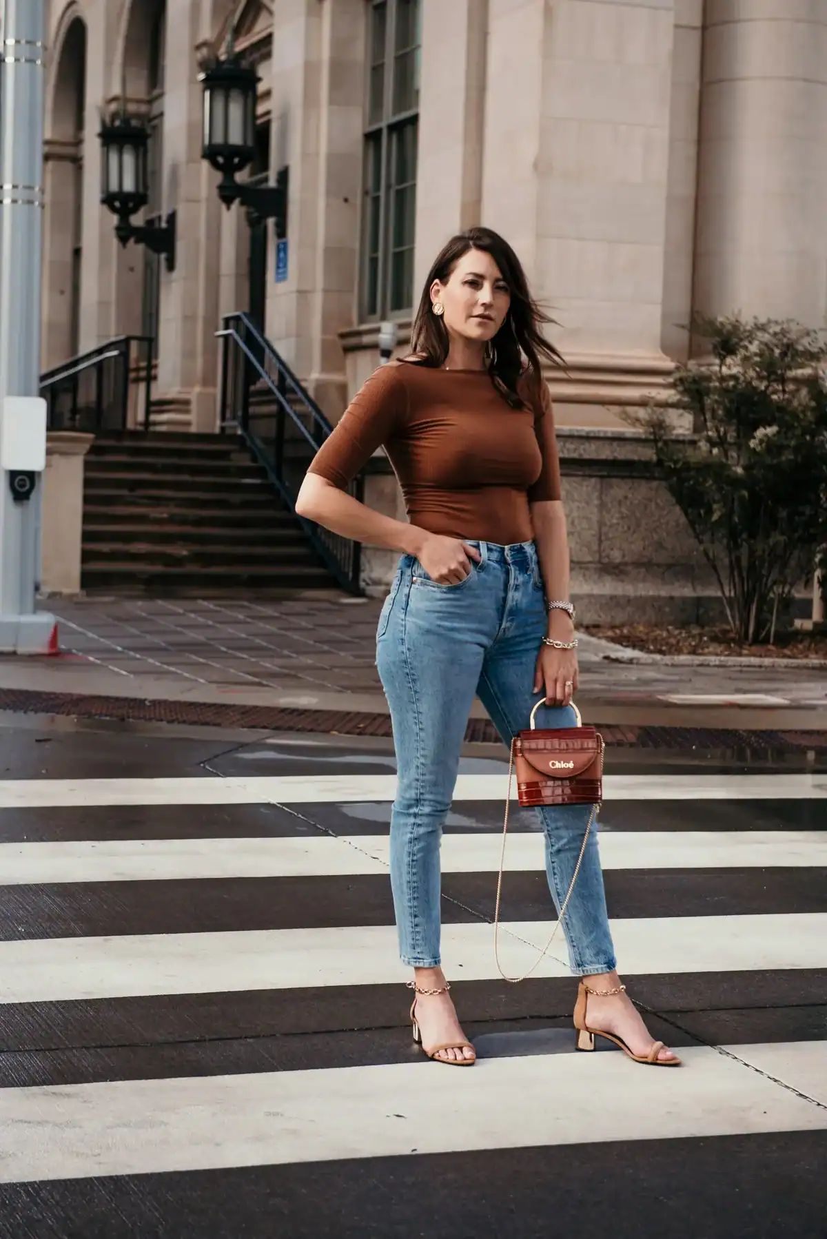 Embrace the autumn spirit with this effortlessly chic ensemble that perfectly bridges summer and fall. The rust-colored fitted top with elbow-length sleeves captures the essence of fall’s warm palette, while classic blue jeans maintain a casual edge.