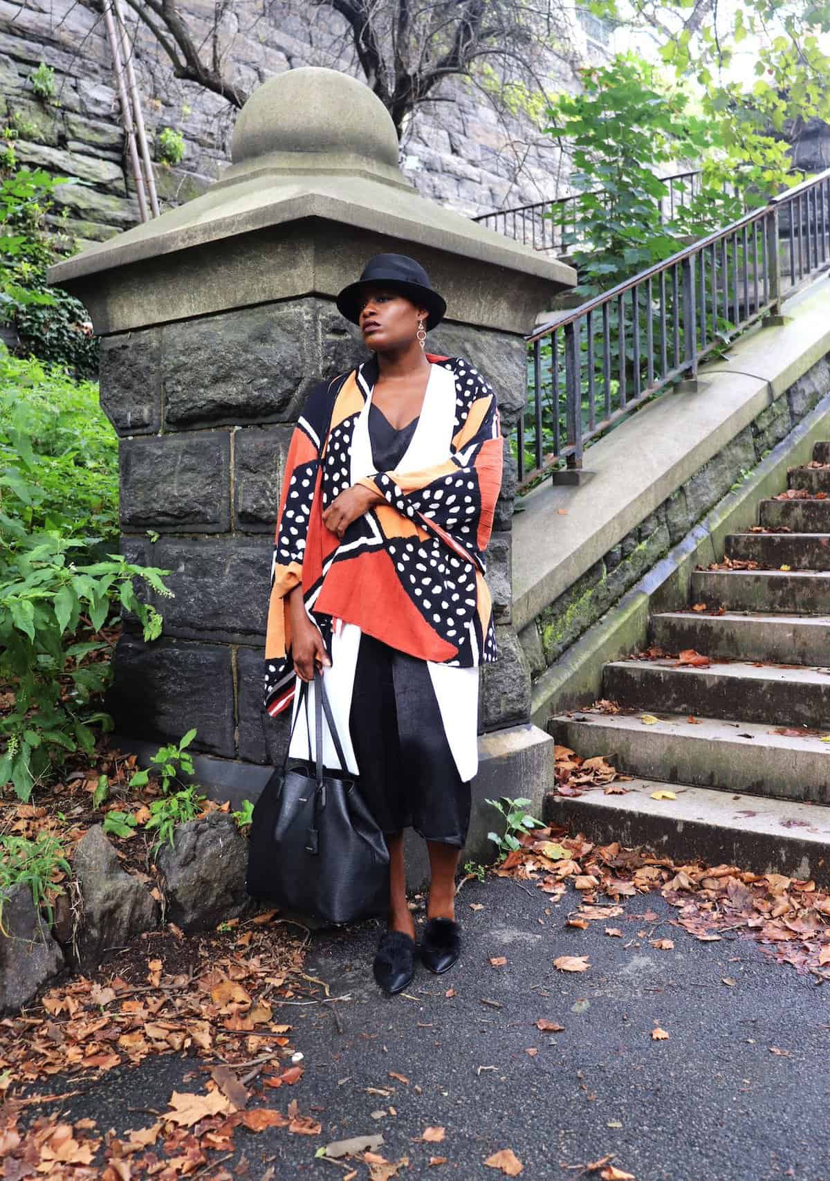 Draped effortlessly over a sleek black dress, it adds both warmth and visual interest to the outfit. The look is anchored by a classic black fedora, which lends a touch of sophistication and protects against chilly breezes.