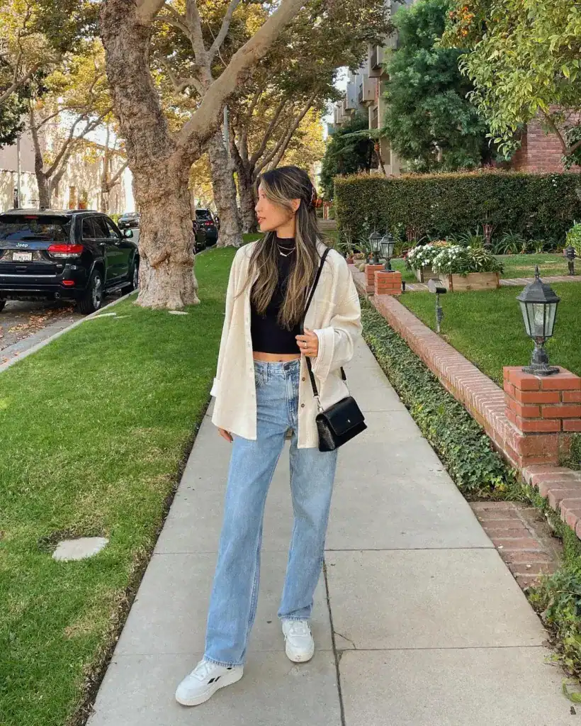 Paired with a black crop top and relaxed-fit light wash jeans, this outfit captures the essence of fall fashion. The white sneakers keep the look casual and practical for everyday wear, while the small black crossbody bag adds a touch of sophistication.