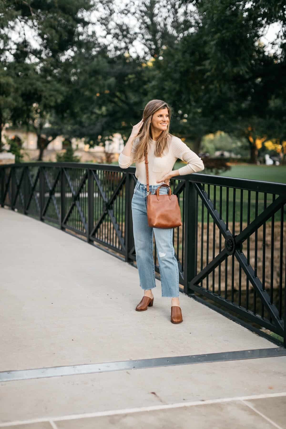 Accessorized with a cognac leather tote and matching mules, this outfit seamlessly blends summer’s ease with autumn’s coziness. The neutral color palette allows for easy mixing and matching throughout the season, making it a perfect foundation for your fall wardrobe.
